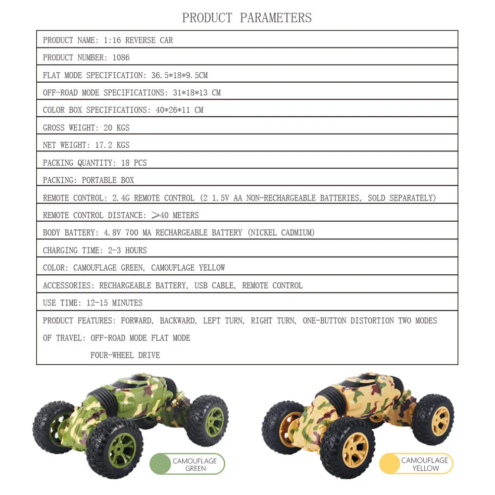 "Основная информация Масштаб: 1/16 Основной цвет: зеленый/желтый Максимальная скорость: ≥10км/ч частота: 2,4 г канал: 4CH Батарея: 2X AA (не входит в комплект) Дистанционное расстояние: ≥30m Батарея: 4,8 V 700Ah батарея (входит в комплект) Время зарядки: около 180 минут Время использования: около 12-15 минут другой материал: пластик, электронный компонент и сплав Вес упаковки: около 1180 г Размер автомобиля: прибл. 36,5*18*9,5 см Размер коробки: 40*26*11 см комплектация: 1х Rc автомобиль (в комплекте Автомобильная батарея) 1х передатчик 1х usb кабель для зарядки