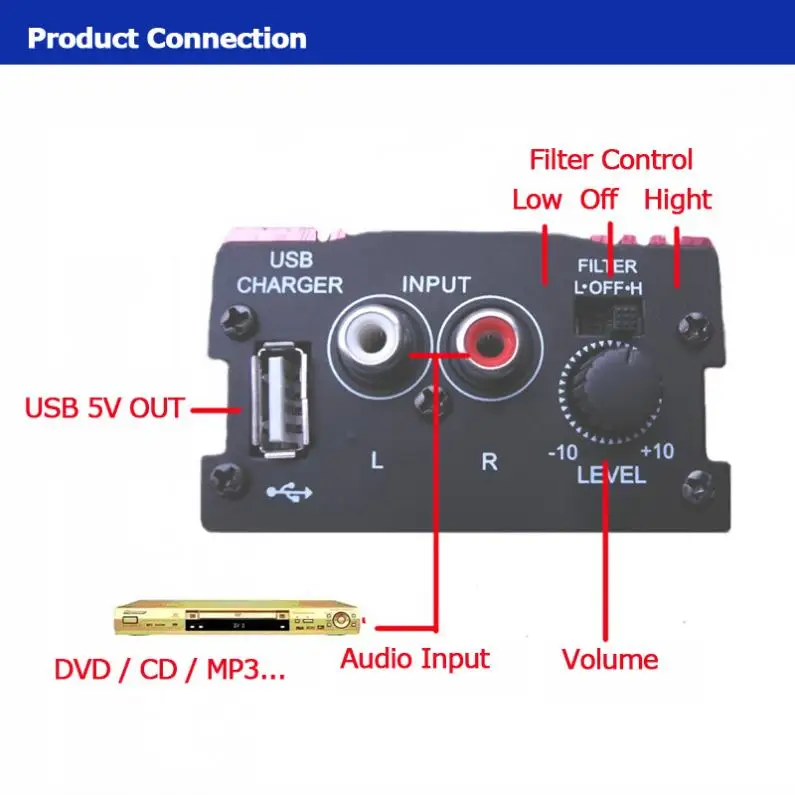 -Usb-порт для зарядки, входной разъем RCA L / R, переключатель фильтра низкого/выключения/пропуска и регулятор громкости на правой стороне.