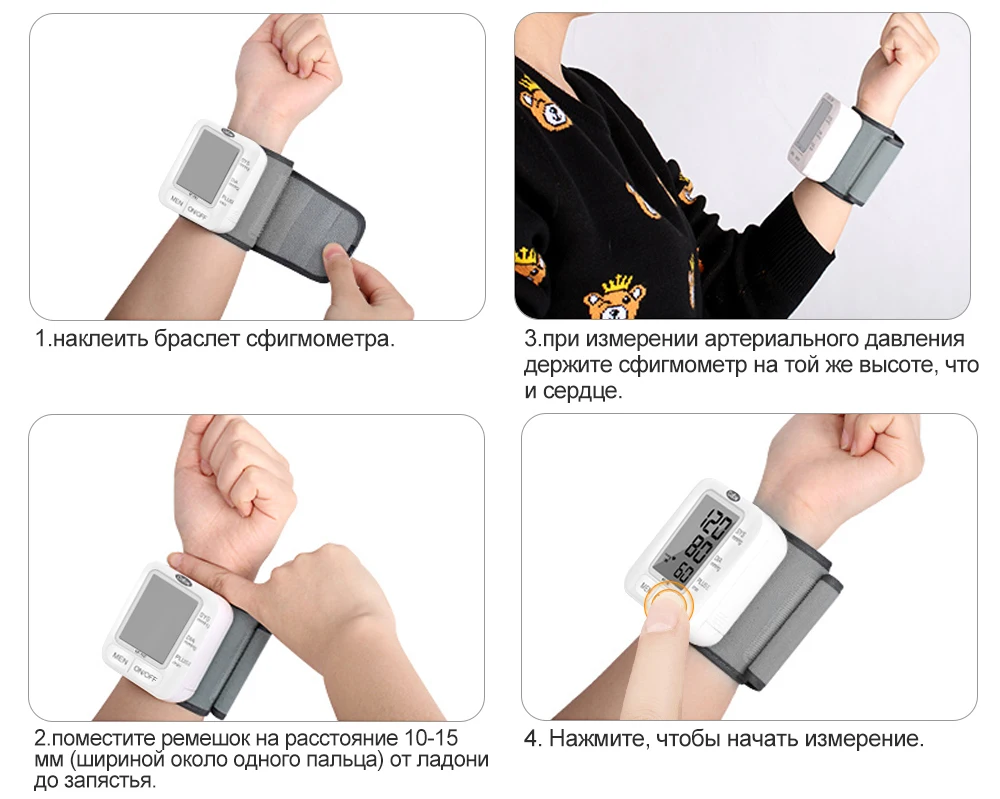 1. наклеить браслет сфигмометра 2. поместите ремешок на расстояние 10-15 мм (шириной около одного пальца) от ладони до запястья. 3. при измерении артериального давления держите сфигмометр на той же высоте, что и сердце. 4. Нажмите, чтобы начать измерение.