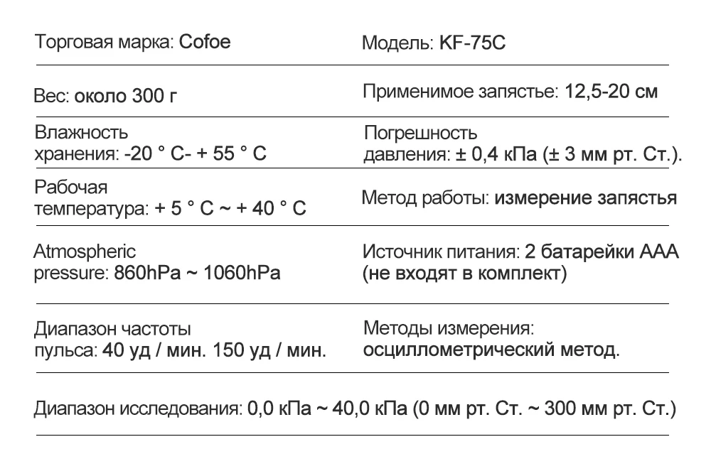 -Название изделия: кровяное давление на запястье -Модель: KF-75C -Дисплей: большой светодиодный экран -Размер: 67 мм * 78 мм * 62 мм -Вес: 95 г (без батарей) -Батарея: 6 В (2 щелочные батарейки AAA не входят в комплект) -Положение: измеряет и отслеживает кровяное давление -Диапазон отображения пульса: 40-150 раз/мин -Диапазон обнаружения: 0,0-40,0 кПа (0-300 мм рт. Ст.) -Память данных: 192 набора