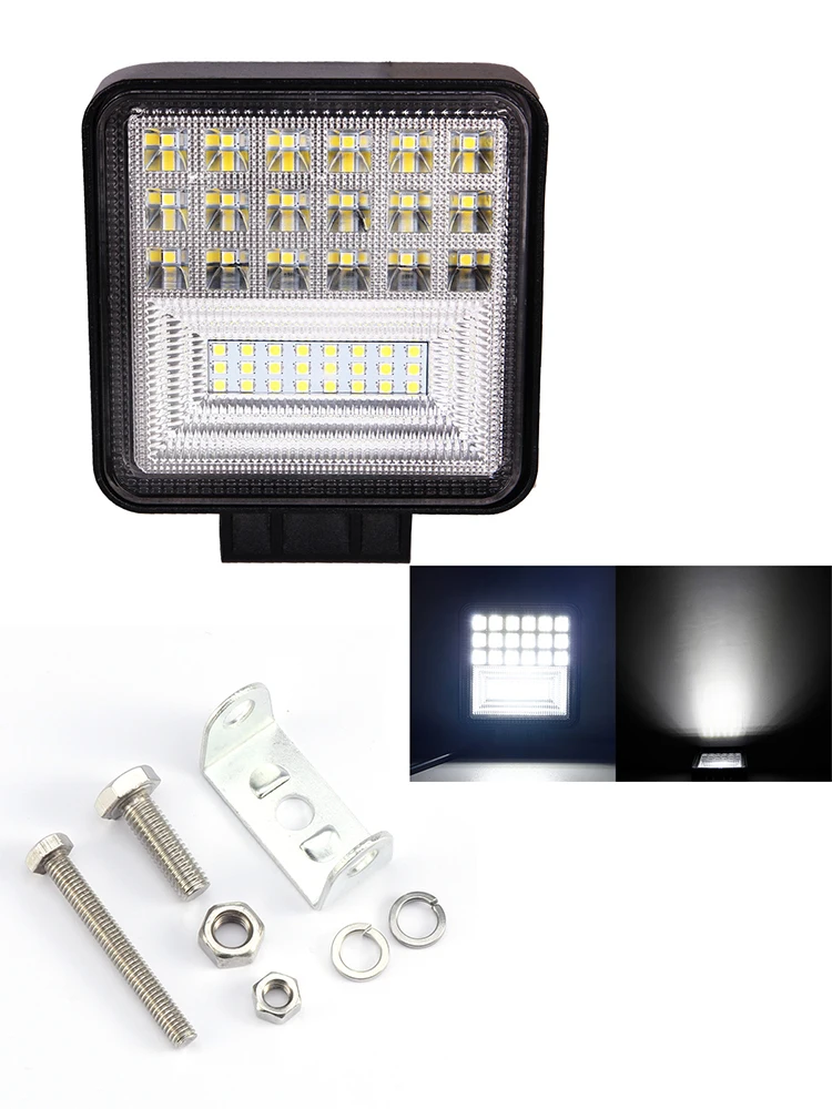 4 дюйма квадратный светодиодный рабочий свет 126 W Описание продукта: Размеры: 4 дюйма Светодиодный аккумулятор: 126 Вт Светодиодный чип: 42 шт. 3 Вт высокомощный светодиодный Вес изделия: 1 кг Размер изделия: 106*40*125 мм Световой поток: 12600LM Входное напряжение: 10-30 В постоянного тока, а также 12 В и 24 В Рабочий ток: 12 В @ 1.8A Срок службы: более 30000 часов Рабочая температура:-40 ~ 85 градусов Цельсия Светодиодный цвет: 6000 K белый Узор луча: комбинированный луч (30 градусов + 60 градусов) Материал: Полностью Литой алюминиевый профиль, высококачественные светодиодные чипы, Объектив ПК Водонепроницаемый скорость передачи данных: IP68 Сертификаты: CE, RoHS, IP68 Гарантия: 1 год Область применения: Прожектор для бездорожья: сигнал заднего хода, ATV, SUV, грузовика, прицепа, вилочного погрузчика, поезда, лодки, наружного освещения и т. Д. Другое освещение: экскаватор, бульдозер, дорожный каток, кран, горная промышленность, трактор, комбайн, зерновая дрель, пожарный двигатель, спасательный автомобиль и т. Д. Домашнее освещение: сад, задний двор, гараж, внутреннее освещение.
