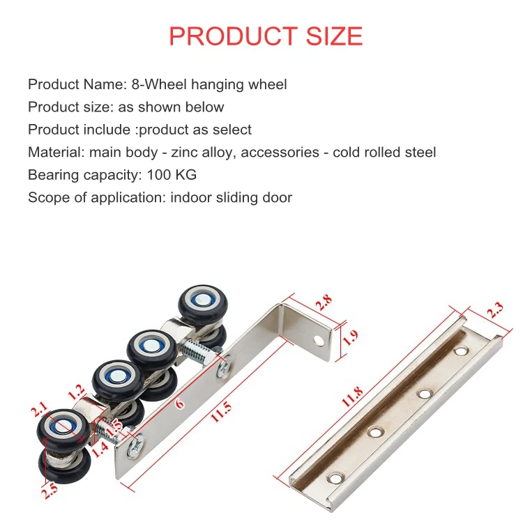 Название продукта: подвесное колесо с 8 колесами Размер изделия: как показано ниже Продукт включает в себя: продукт как выбрать Материал: основной корпус-цинковый сплав, аксессуары-холоднокатаная сталь Грузоподъемность: 100 кг Область применения: крытая раздвижная дверь
