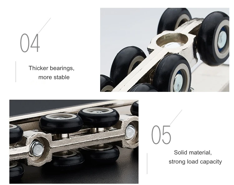 1. Материал из цинкового сплава -- эти дверные колеса были полностью изготовлены из высококачественного материала. Гладкий и бесшумный. Безусловно, это самый оптимальный и разумный выбор для украшения вашего дома! 2. Высокое качество и бесшумный-продуманная технология производства создают изысканный и прочный дверной ролик. Бесшумный медведь и скользящий шар делают его очень легким и довольно тянуть и толкать. 3. Нейлоновое скользящее колесо-многофункциональное нейлоновое скользящее колесо может выдерживать 100 кг, 8 колес на ролике. Подходит для стеклянных дверей, деревянных дверей, внутренних дверей. 4. Прочное качество-идеально подходит для использования стеклянных раздвижных дверей душевой комнаты. Обеспечивает продолжительный срок службы. 5. Обновите стиль, двойное армирование колес, более стабильное.