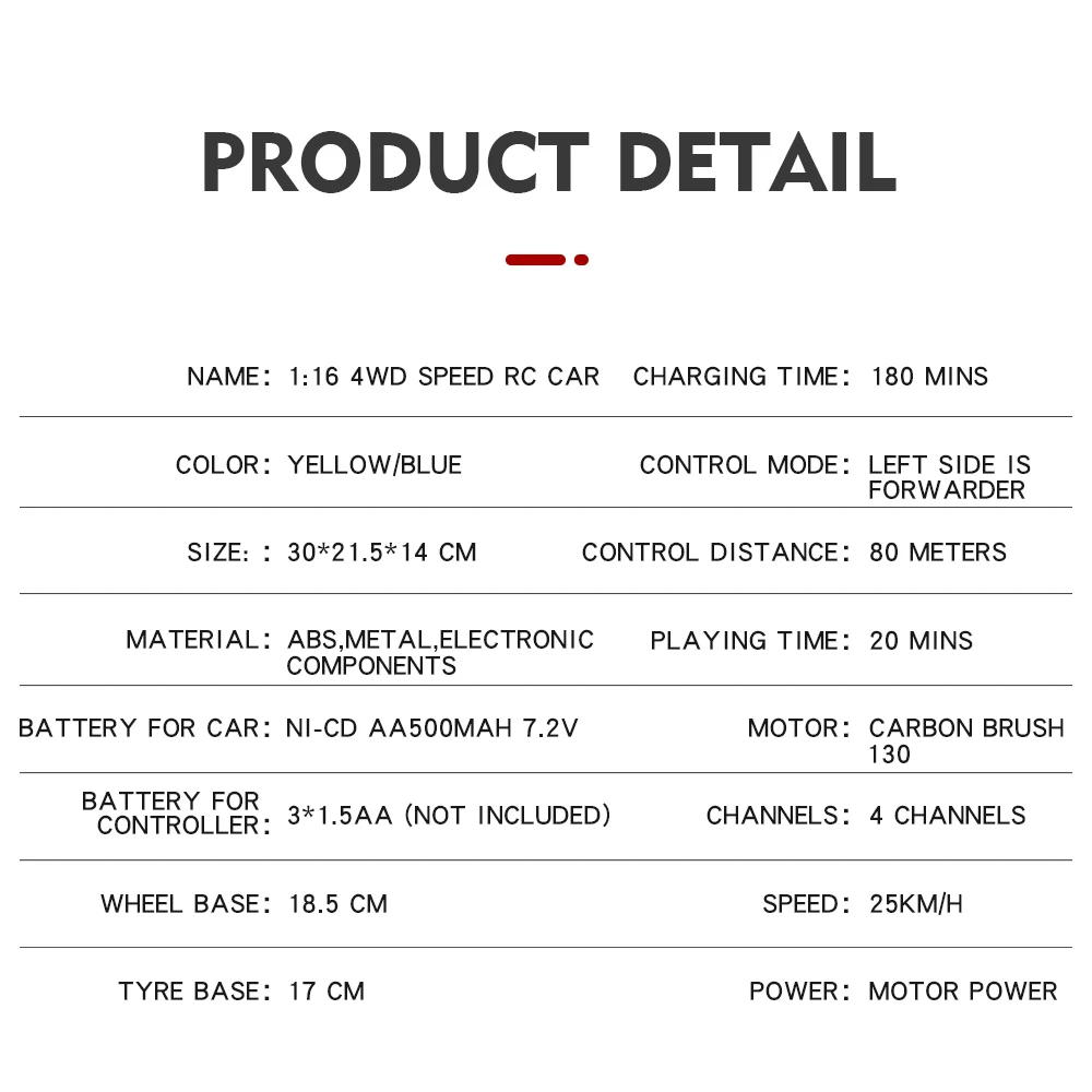 Пропорции тела: 1:16 Размер изделия: 30*21,5*14 см Новый продукт точка продажи: новый дизайн крутой пульт дистанционного управления; обновление 130 мощный мотор, больше мощности; Использование больших шин, более сильное сцепление, форма кулера; пикап. Материал изделия: ПВХ, АБС, электронные компоненты Время использования: 20 минут или около того Время зарядки: 3 часа Батарея дистанционного управления: 3 секции "AA" (возьмите свой) Батарея корпуса: стандарт-cd AA500mah 7,2 V батарея Скорость: 25 км/ч или около того Режим дистанционного управления: пульт дистанционного управления 2,4G Приводной двигатель: 130 мотор, двухколесный привод Зарядное устройство: usb-кабель для зарядки Особенности продукта: управление ручкой, движение вперед и назад, поворот влево и вправо. Вес изделия: 1,17 кг Этот список содержит: Пульт дистанционного управления автомобиля * 1, Пульт дистанционного управления * 1, Корпус аккумуляторной батареи * 1, Usb-кабель для зарядки * 1.