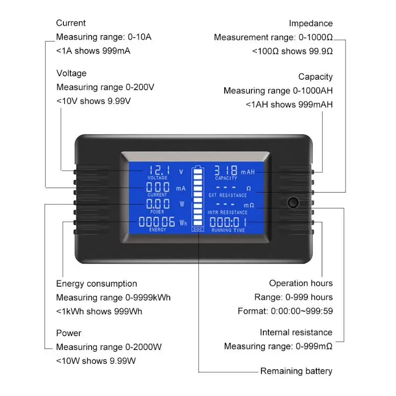 Этот счетчик в основном используется для тестирования всех видов напряжения батареи, разрядного тока, разрядной мощности, сопротивления разряда, внутреннего сопротивления, емкости, энергии сброса, потребления энергии и времени работы, И отображение данных измерений через ЖК-экран.