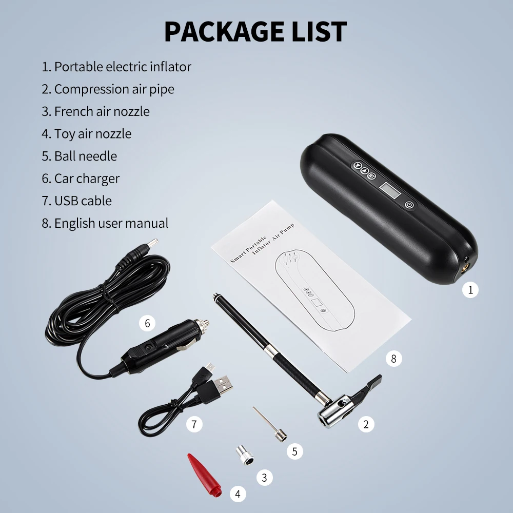 Package Contents: 1 x Portable Electric Inflator, 1 x Compression Air Pipe, 1 x French Air Nozzle, 1 x Toy Air Nozzle, 1 x Ball Needle, 1 x Car Charger, 1 x USB Cable, 1 x English User Manual