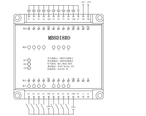 В MBSL8DI8RO модуль 8-ми канальный цифровой изолированный входной сигнал и 8-канальный цифровой реле изолированный выход модуль, который выводится через единичный RS485 интерфейсом. Модуль принимает стандартную Modbus RTU связь, которая может непосредственно адаптироваться к различным программным обеспечением конфигурации ПК, PLC, DCS и так далее. Блок питания модуля и электрические сигналы связи RS485 изолированы друг от друга, эффективно подавляя различные типы режимов серии и помех общего режима, а также обеспечивая стабильную и надежную работу модуля.