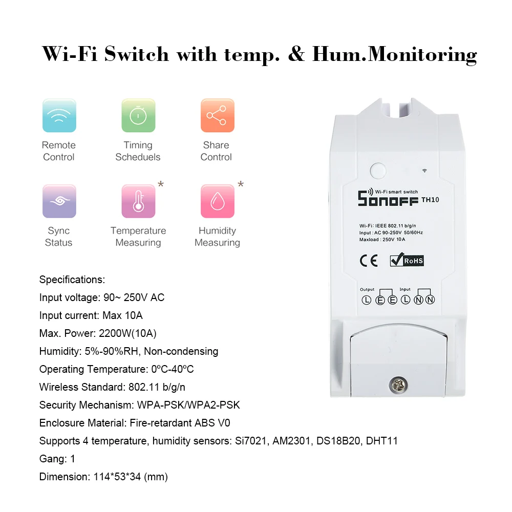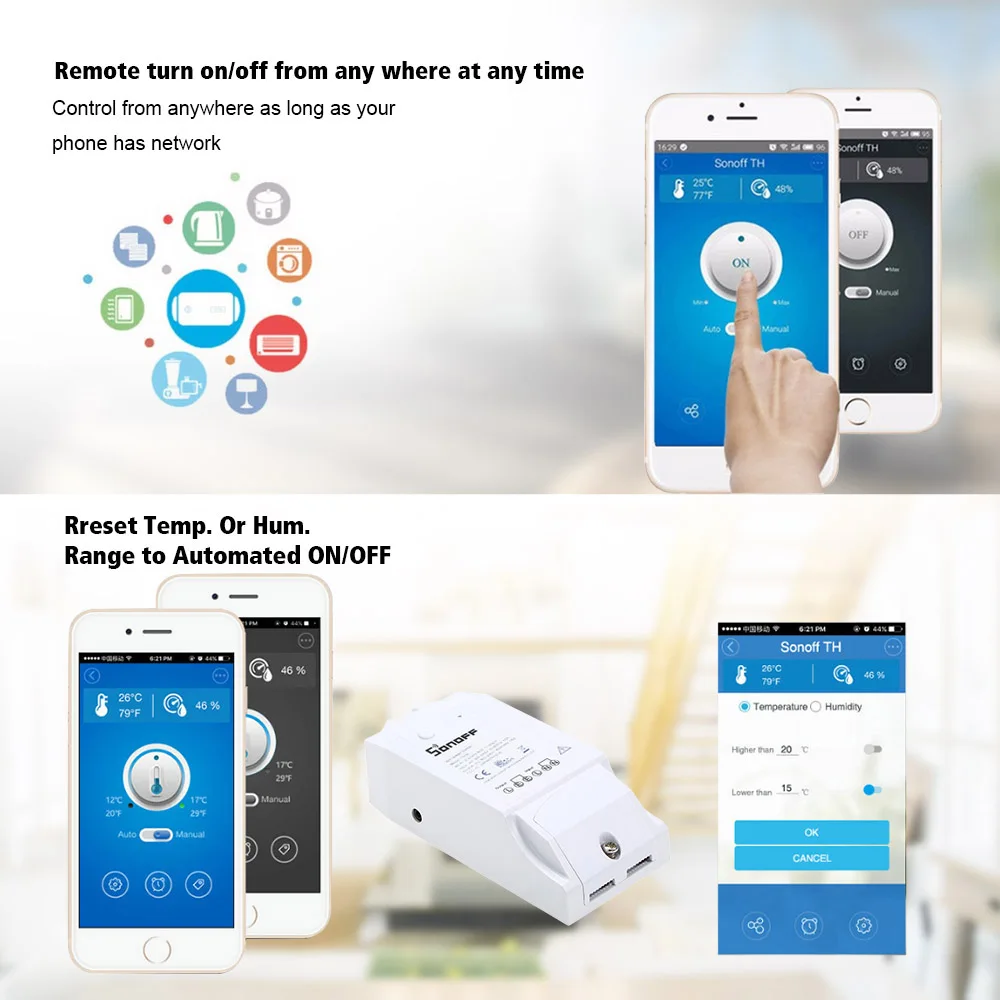 Sonoff является универсальным переключателем для вашей системы умного дома, чтобы удаленно и автоматически включать/выключать любые приборы с помощью приложения для телефона. Когда температура или Влажность окружающей среды попадает в диапазон, он автоматически включится или выключится подключенные устройства. Он также поддерживает время включения/выключения приборов и поддерживает предустановку диапазона для температуры или влажности. Работайте с Sonoff TH16, вы можете сделать свой дом умнее.