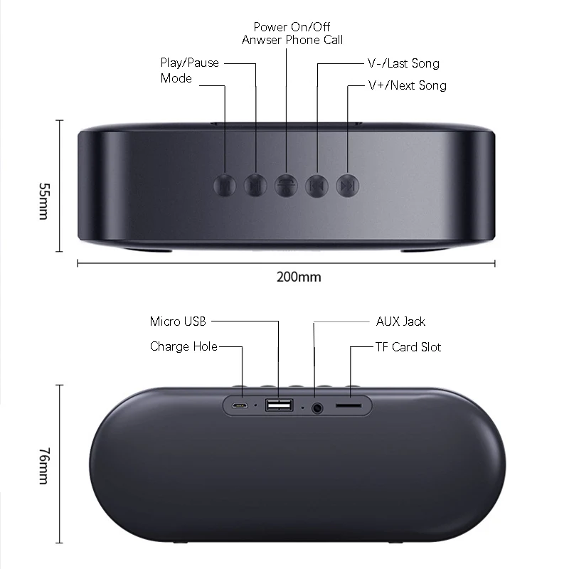 Впечатляюще чистый и полный диапазон звука автоматически подключается к последнему подключенному устройству Aux-in jack и 3,5 мм аудио кабель для устройств, не связанных с Bluetooth Встроенный микрофон для звонков без рук поддерживает до 32 ГБ Micro-SD карта поддерживает MP3, WMA,WAV, FLAC, APE автоматически выключается через 10 минут, если нет ручной работы и нет подключенного устройства Батарея: Встроенный литиевый аккумулятор 2000 мАч выход: мощность: 10 Вт Размер: 200*76*55 мм Вес: 468 г (включая встроенный литиевый аккумулятор)