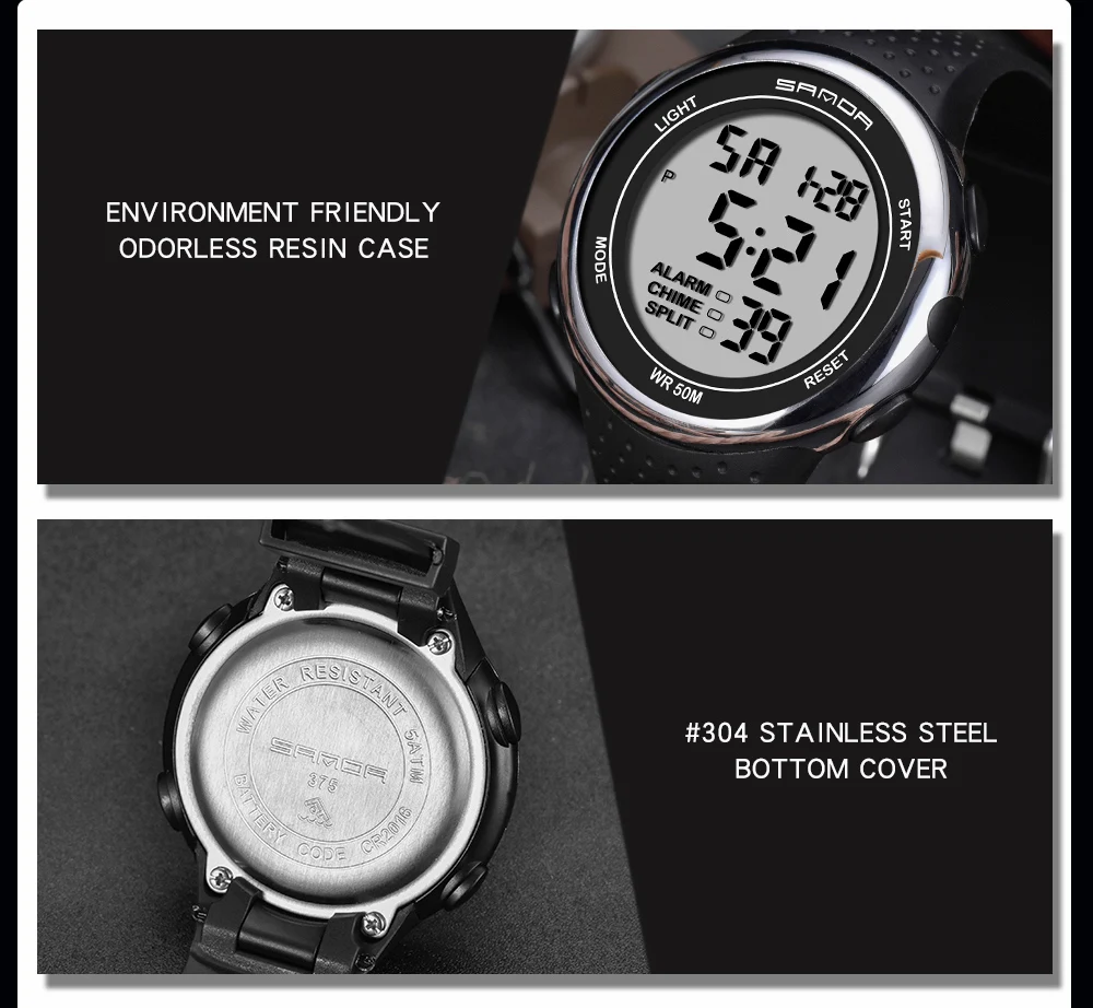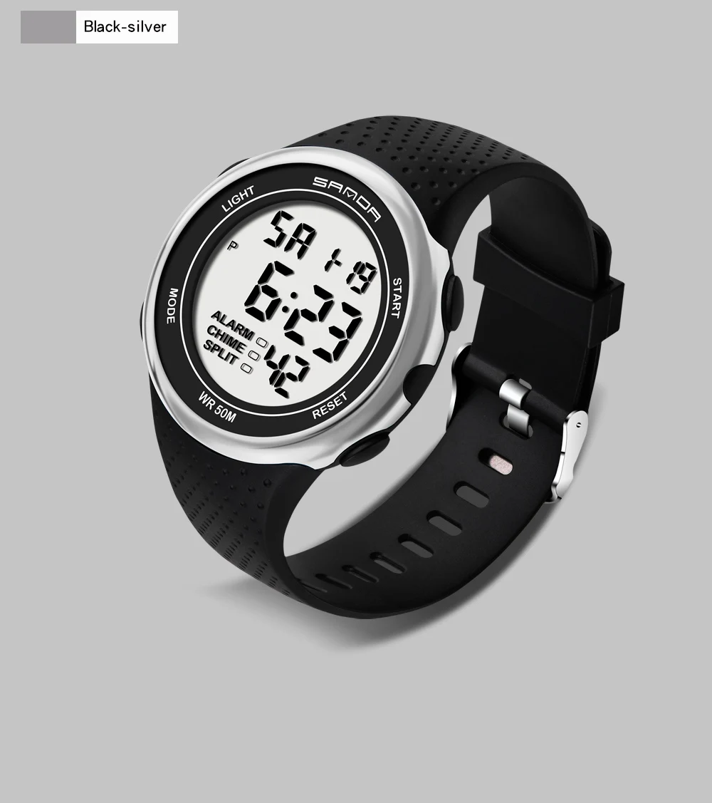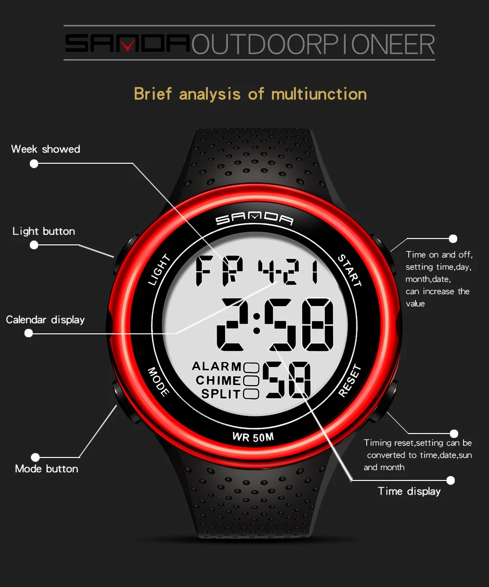 Марка: Sanda Модель: 375 Специальные функции: световой сигнал, Будильник, хронограф, календарь, индикация 24 часа, отображение недели, отображение месяца Тип дисплея: Цифровой Для чего подходит этот товар: Мужской Стиль: Повседневное Водонепроницаемость: 50 м Тип часового механизма: электронный Движение происхождения: Япония Модель движения: 2016 Марка движения: Япония Диаметр циферблата: 46 мм Толщина: 12,5 мм Тип короны: плоская конусная Корона Тип нижней части стола: Обычный Материал зеркала: минеральное укрепленное стеклянное зеркало Стиль застежки: Пряжка Материал пряжки: нержавеющая сталь Материал ремешка: Резина Форма циферблата: круглый Чехол Материал: смола Цвет: черный, черный, серебристый, черный, красный, черный, синий, черный, золотой, черный, розовое золото