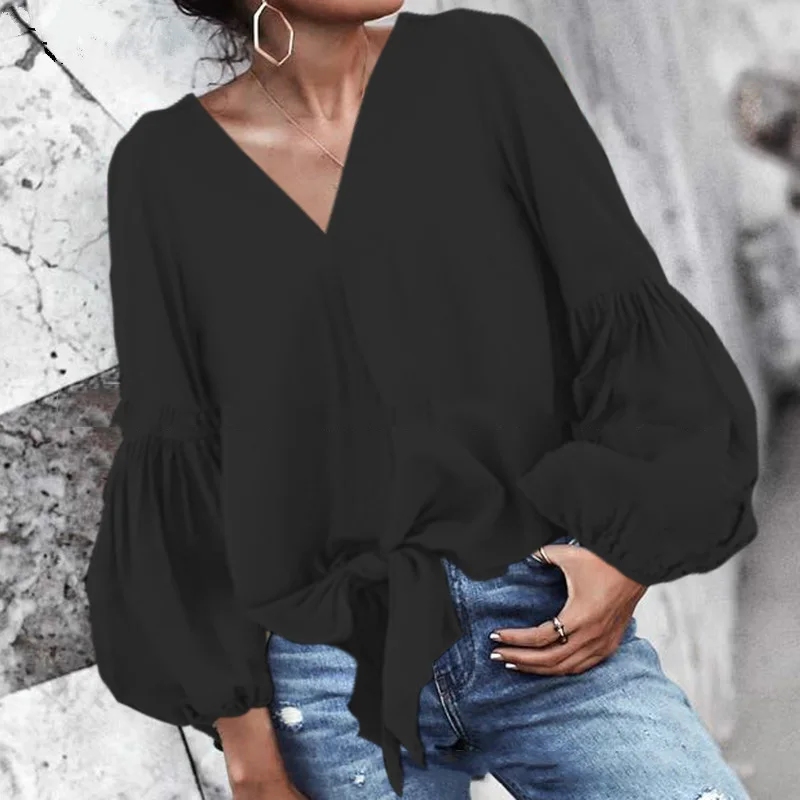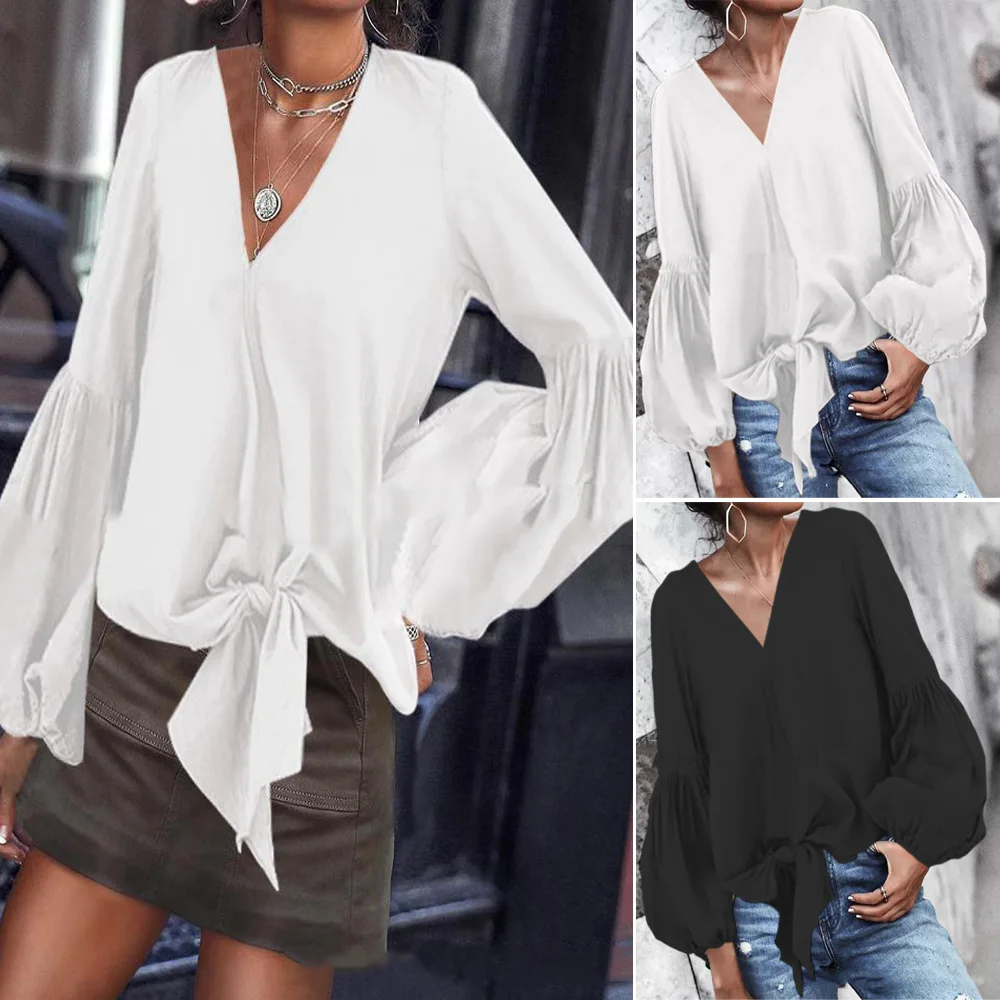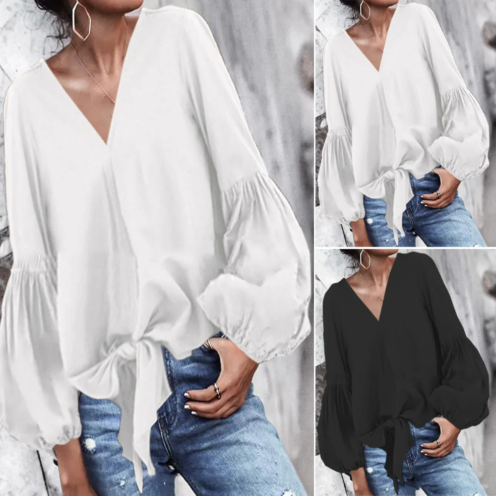 * Описание товара: повседневный, свободный, v-образный вырез, Пышный рукав, завязанный, сплошной цвет