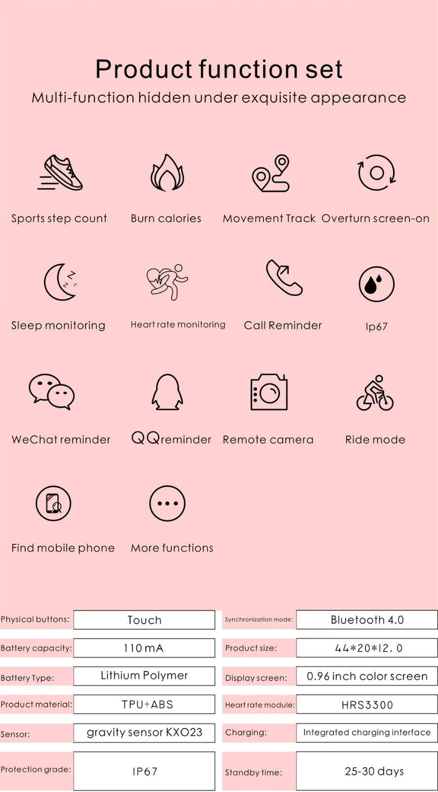 Экран осветляет время, поднимая руку, чрезмерное напоминание о сидении, напоминание о будильнике, мобильный телефон, поиск, Отклонение вызова, встряхивание для фотографирования, установка объектива движения, обмен информацией о фитнесе, напоминание о вызове, режим беспокойства,