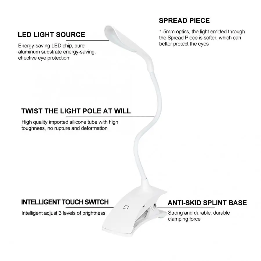 Удобно управлять одним нажатием кнопки. Встроенный спред, хорошая теплоотдача и длительный срок службы. Этот продукт имеет новый внешний вид, гибкую регулировочную головку лампы и направление. Вращение на 360 градусов-Полюс лампы может вращаться вверх и вниз, левое и правое свободное вращение и растягиваться. Энергосберегающий светодиодный чип, чистая алюминиевая подложка, энергосберегающая, эффективная защита глаз. Противоскользящее основание-прочная и долговечная Зажимная сила. Интеллектуальный сенсорный выключатель-интеллектуальная регулировка 3 уровня яркости. С дизайном зажима, его можно использовать в качестве стола, настольной лампы для татуировки и настольной лампы для дизайна ногтей.