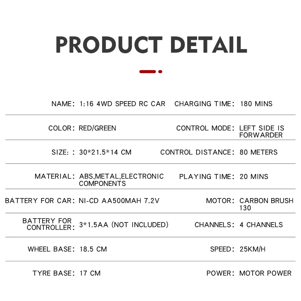 Соотношение тела: 1:16 Размер продукта: 30*21,5*14 см Новая точка продажи продукта: новый дизайн крутой пульт дистанционного управления; обновление 130 мощный мотор, больше мощности; Использование больших шин, более сильное сцепление, форма охлаждения; пикапов. Материал продукта: ПВХ, АБС, электронные компоненты Время использования: 20 минут или около того Время зарядки: 3 часа пульт дистанционного управления Батарея: 3 секции "AA" (возьмите свой собственный) батарея корпуса: стандартный Ni-cd AA500mah 7,2 V Скорость батареи: 25 км/ч или так приводной двигатель: 130 мотор, двухколесный привод Зарядное устройство: Характеристики USB зарядного кабеля: Управление ручкой, вперед и назад, поворот влево и вправо. Вес продукта: 1,17 кг комплектация: пульт дистанционного управления автомобиля * 1, пульт дистанционного управления * 1, корпус аккумулятора * 1, USB кабель для зарядки * 1.