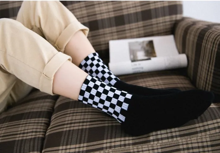 Women's Novelty White and Black Squares Skateboard Socks Chic Harajuku Checkerboard Hiphop Socks Sox Long Sock