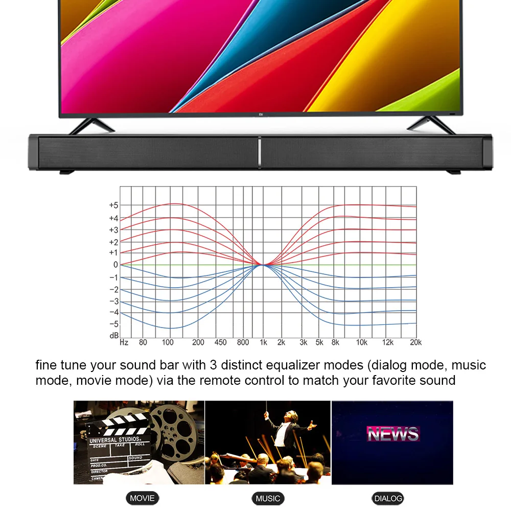 3 различных режима эквалайзера: Настройте звуковую панель с 3 различными режимами эквалайзера (режим диалога, Режим музыки, Режим кино) с помощью пульта дистанционного управления, чтобы соответствовать вашему любимому звуку.