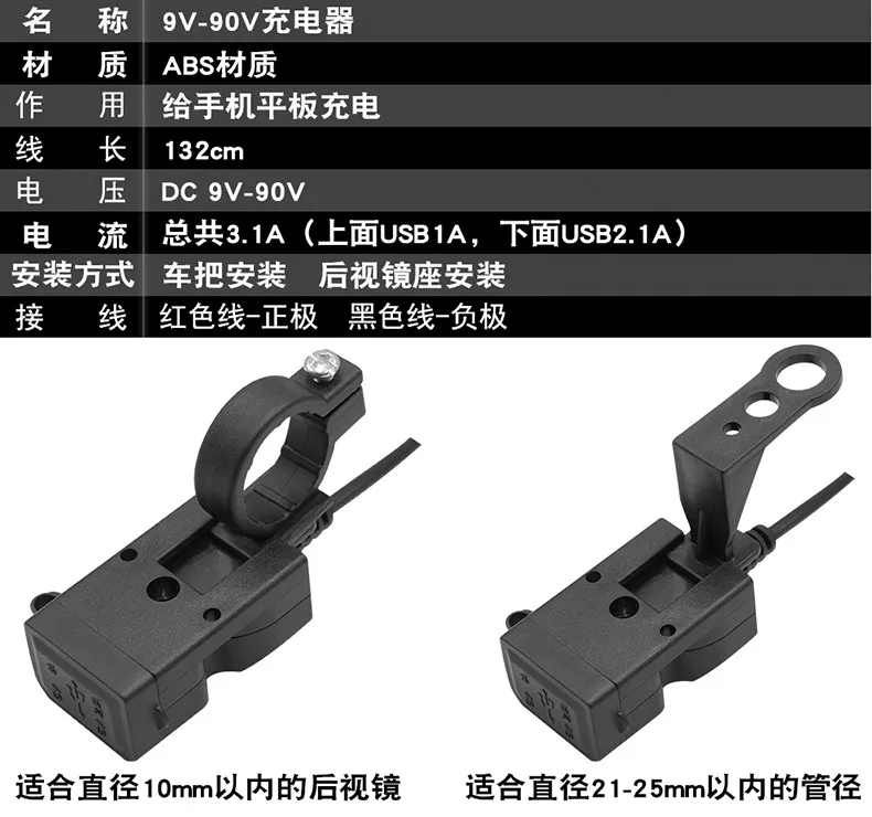 Водонепроницаемый двойной USB 12 V мотоцикл зарядное устройство на руль розетка с переключателем и креплениями Описание товара: Особенности: -Двойной usb-разъем, вы можете одновременно заряжать телефон на два -Двойной usb-порт, водонепроницаемый чехол USB Как установить гнездо: -Подключите красную линию к "+" и черную линию к "-" -Поместите зажим ручки на рукоятку мотора и винт itr фиксируется на заднее зеркало/сиденье коробки. Примечание: -Товар предназначен для мотоцикла 9-24 В (другие вольт, пожалуйста, не покупайте этот товар. Это может быть случайным) -Не используйте тепловые электронные аксессуары -Не подключайте электронные аксессуары, когда двигатель не работает Материал: АБС-пластик Входной интерфейс: 9-24 В, 9-90 в Выходной интерфейс: 1A/2.1A Подходящий тип: для 90% мотоциклов/электрические мотоциклы