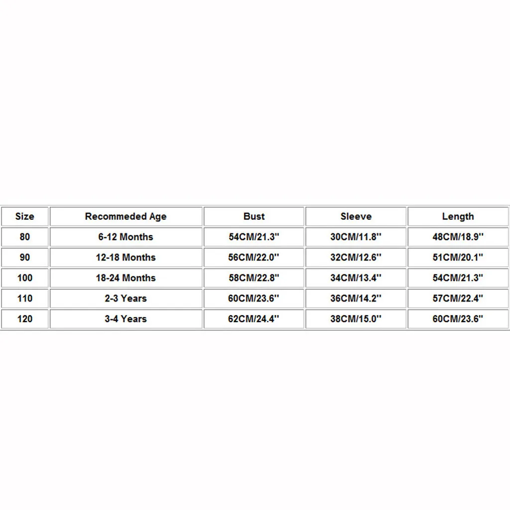 РазмерыРекомендуемый возрастОбхват грудиРукаваДлина806-12 месяцев54 см/21,3"30 см/11,8''48 см/18,9''9012-18 месяцев56 см/22,0''32 см/12,6''51 см/20,1"10018-24 месяцев58 см/22,8"34 см/13,4''54 см/21,3"110От 2 до 3 лет60 см/23,6''36 см/14,2''57 см/22,4"120От 3 до 4 лет62 см/24,4''38 см/15,0''60 см/23,6"