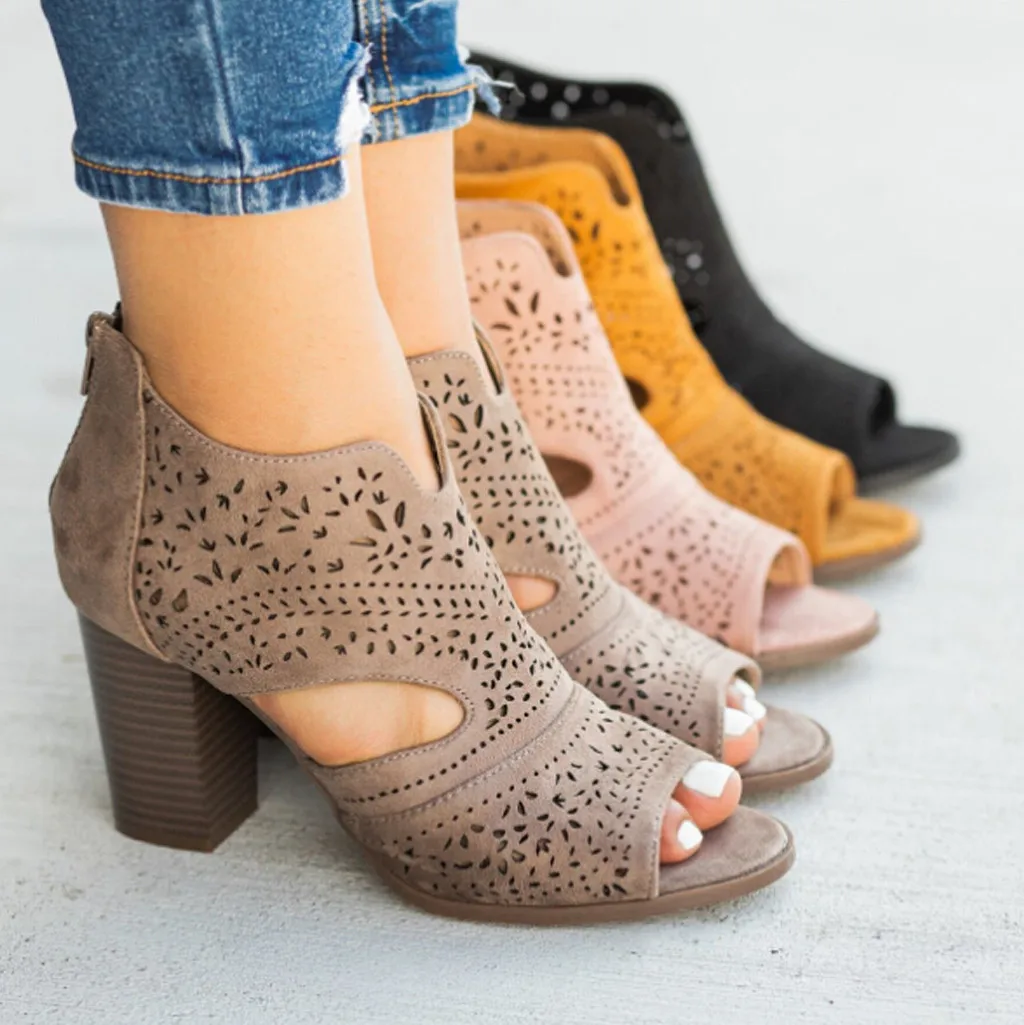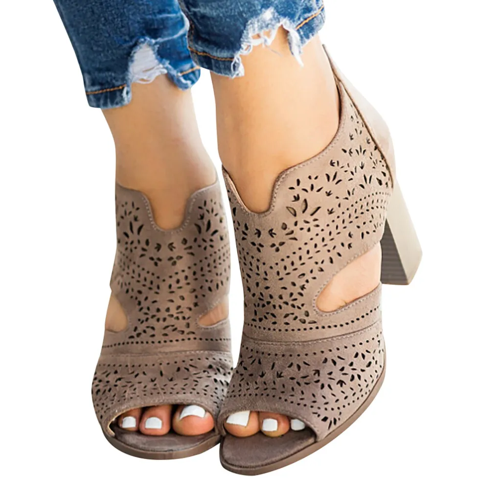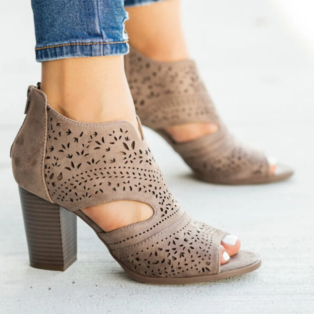 2019 г., Женская однотонная повседневная обувь на толстом каблуке шикарные босоножки с лазерными вырезами сандалии с открытым носком на молнии
