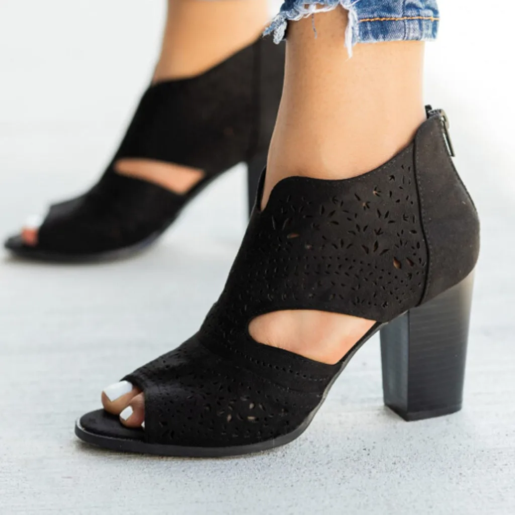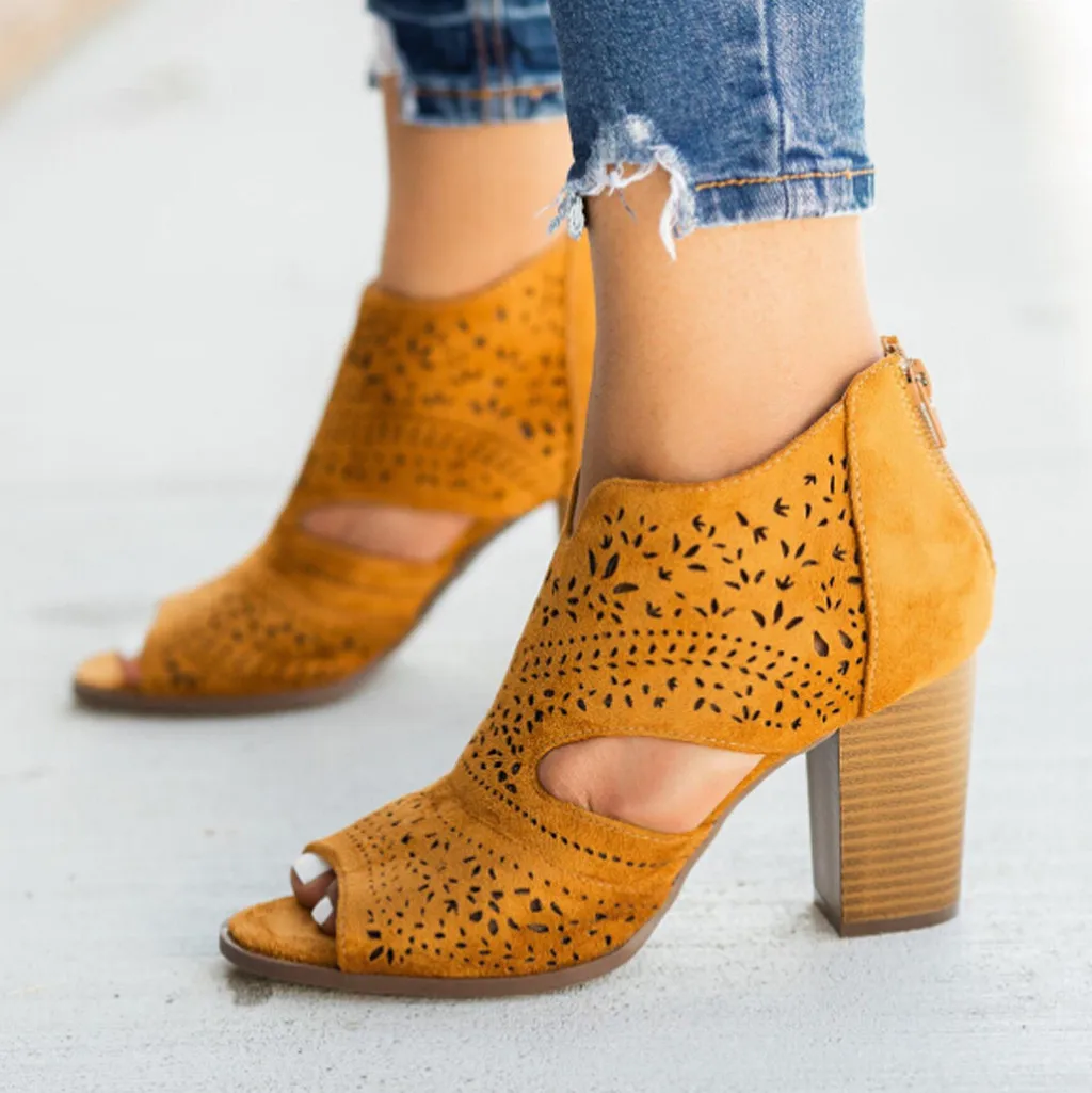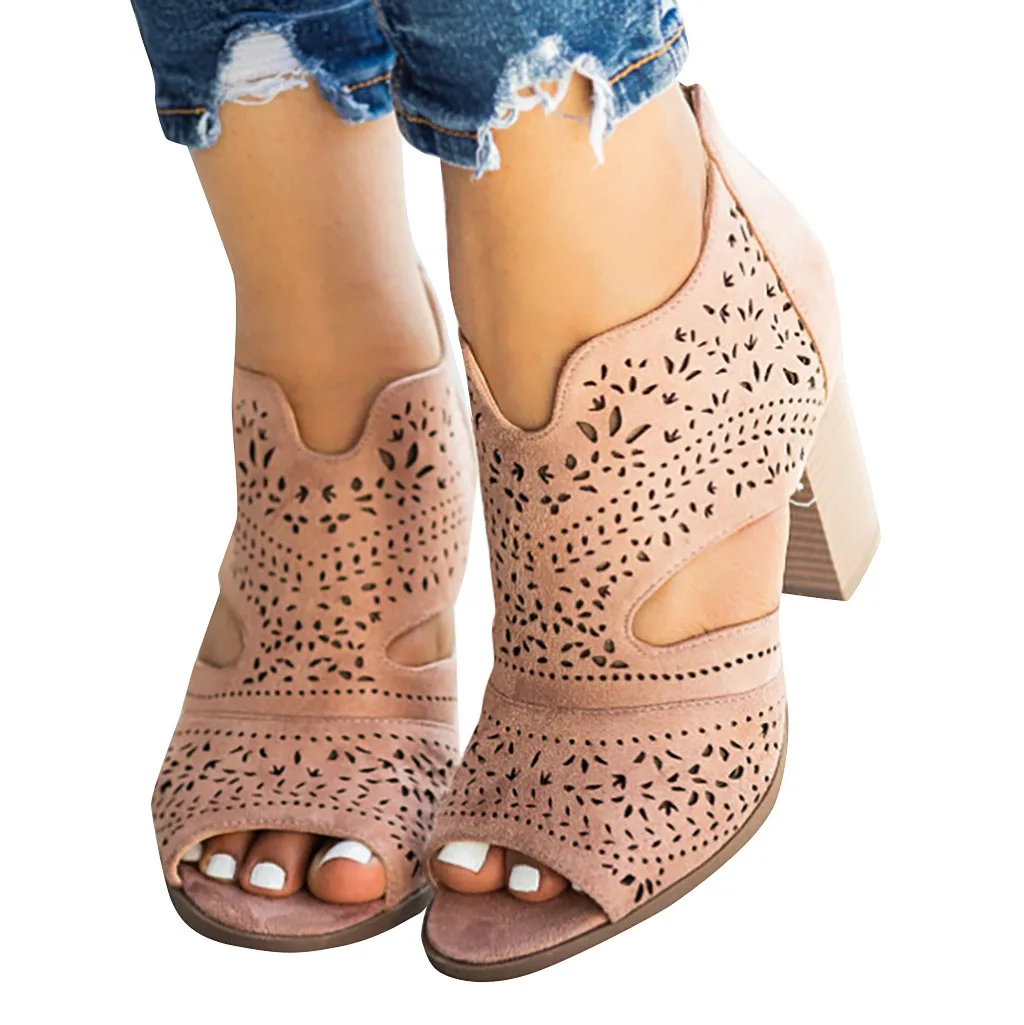 2019 г., Женская однотонная повседневная обувь на толстом каблуке шикарные босоножки с лазерными вырезами сандалии с открытым носком на молнии
