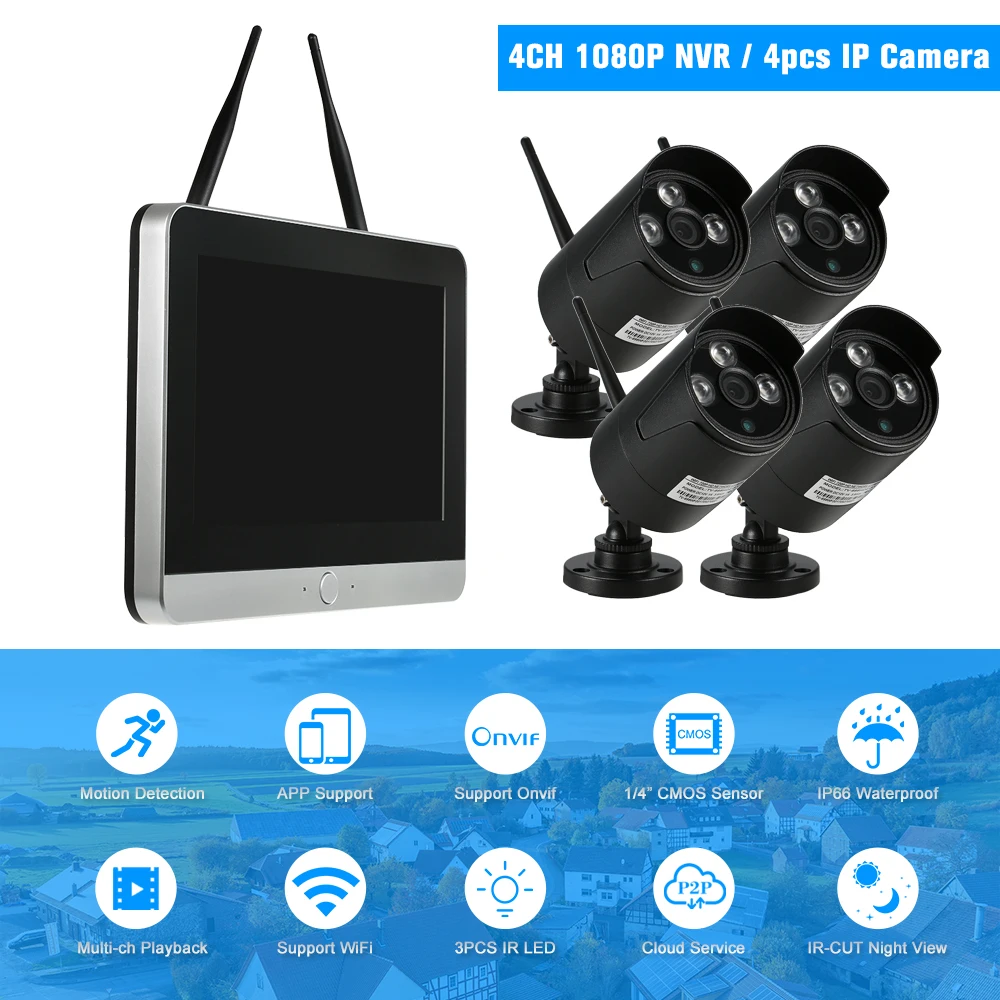 * Состоит из 4CH 1080P HD WiFi NVR + 4 шт. 1.0MP Беспроводная WiFi Водонепроницаемая Наружная цилиндрическая ip-камера.