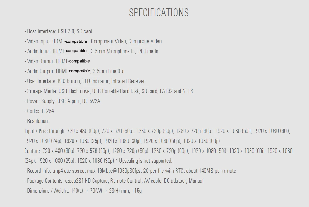 С помощью этого видео 284 HD, вы можете снимать до 1080P видео с HD, Ypbpr (компонент) или композитный порт, такой как blue ray, телеприставка, компьютер, игровая коробка, VHS и т. Д. С пультом дистанционного управления, может установить входной сигнал вручную, качество записи, Или запечатлеть неподвижное изображение с помощью кнопки SNAPSHOT.