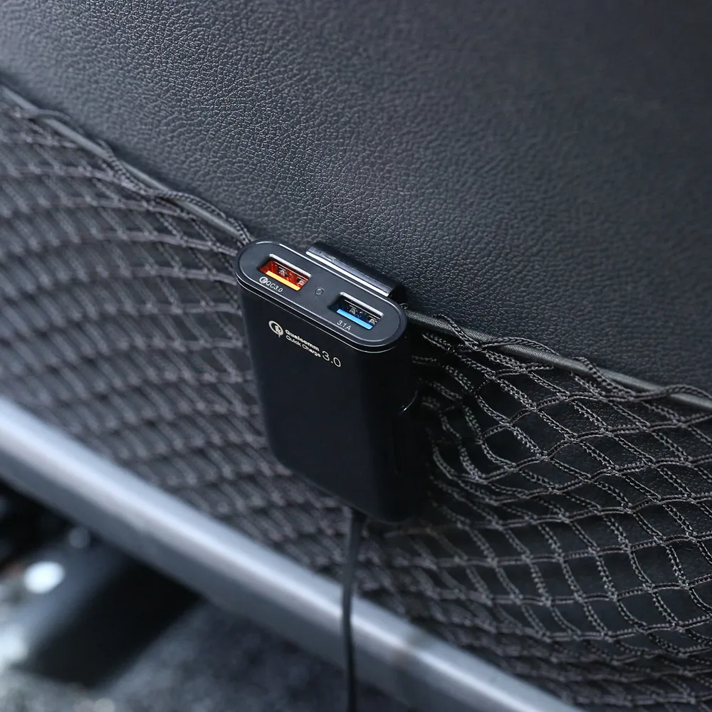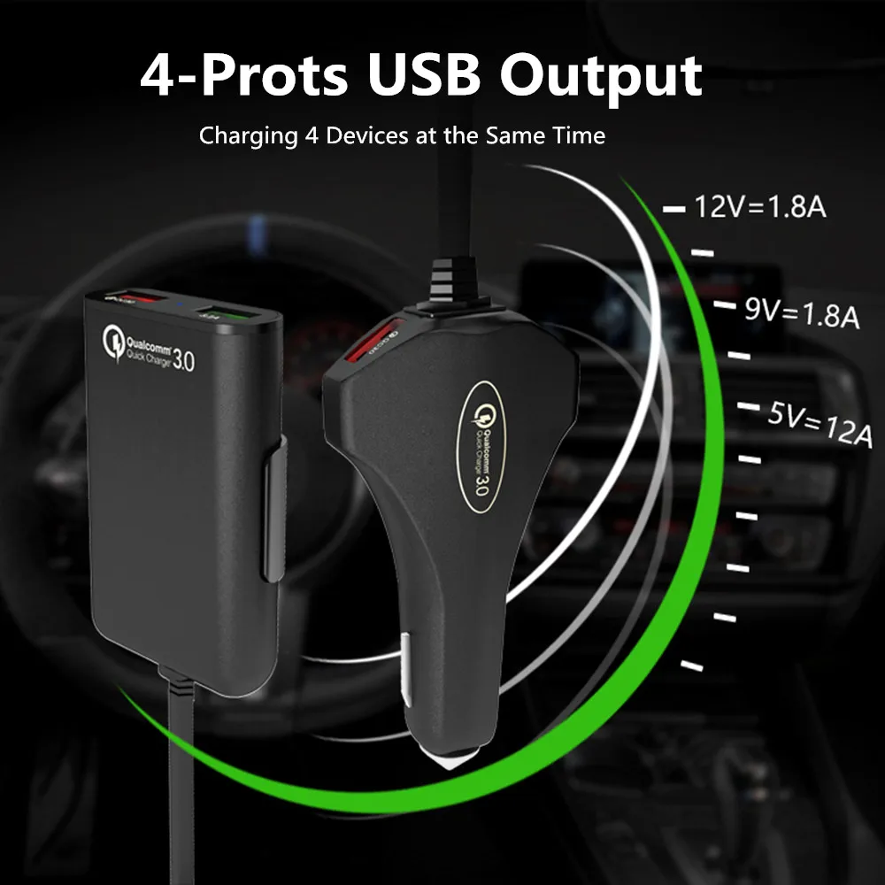 Name: Four USB car charger with safety hammer car charger qc3.0 fast charge 3.1A one for two Colour: Black Material: PC fire retardant material Input voltage: 12V-24V Output: 3*QC3.0: 5V/3A, 9V/1.8A, 12V/1.5A 1*USB 5V/3.1A Quick Charge 3.0 fast charging technology, backward compatible with QC2.0; Line length: 1.7 meters List: Four USB car charger with safety hammer car charging *1