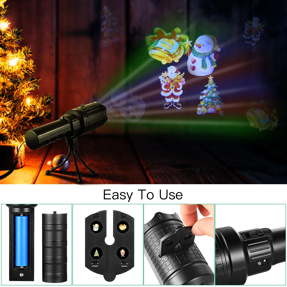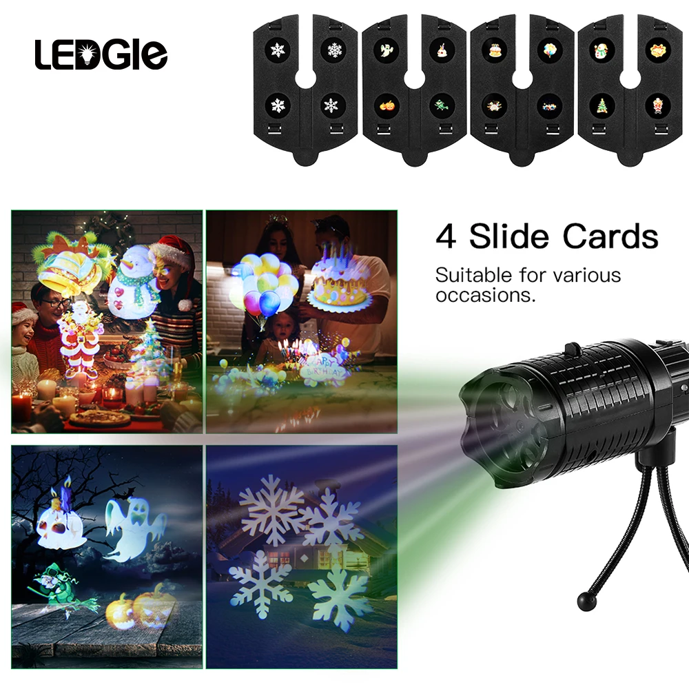 LEDGLE®-Один мир, один свет. Здесь поставляется универсальный фонарик для вас! Вы можете легко Переключить продукт от фонарика до проекционной лампы в соответствии с вашими потребностями. В том числе 4 слайд-карты, способные создать идеальную атмосферу для фестивалей, дня рождения и других праздников.