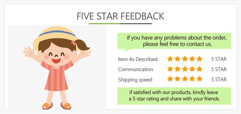 1. Мы полагаемся на нашу репутацию и удовлетворенность клиентов, чтобы добиться успеха. Поэтому ваши отзывы очень важны для нас. Пожалуйста, оставьте нам 5 звезд отзывы, если вы удовлетворены нашими товарами и обслуживанием. 2. Мы заботимся о наших уважаемых клиентах и всегда сделаем все возможное, чтобы помочь вам. 3. Пожалуйста, дайте нам возможность решить любую проблему. Мы понимаем проблемы и разочарования, которые вы можете иметь, и сделаем все возможное, чтобы решить проблемы. 4. Пожалуйста, напишите нам, прежде чем оставить отрицательный отзывы или открыть любой спор. Мы поможем вам решить проблему.