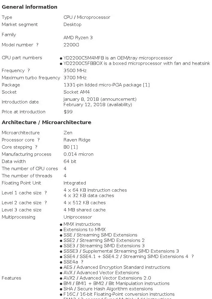 Спецификации AMD Ryzen 3 2200G