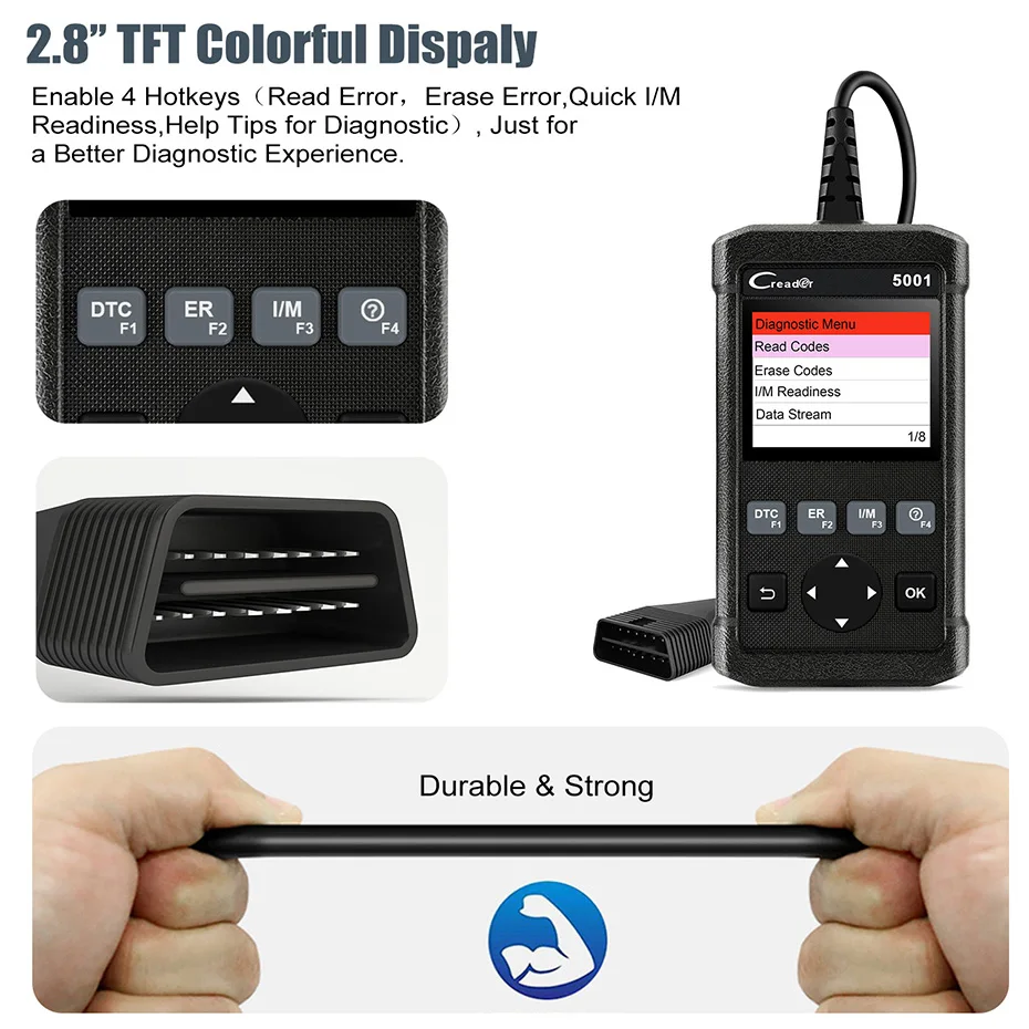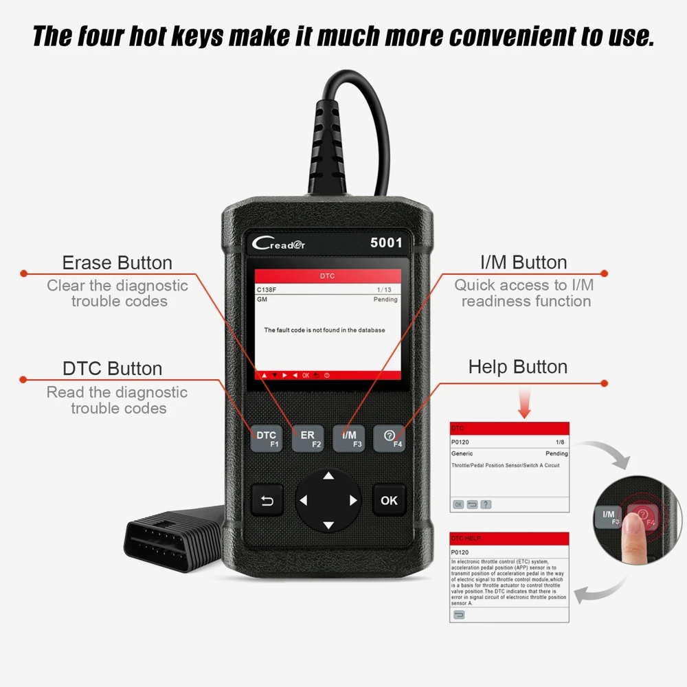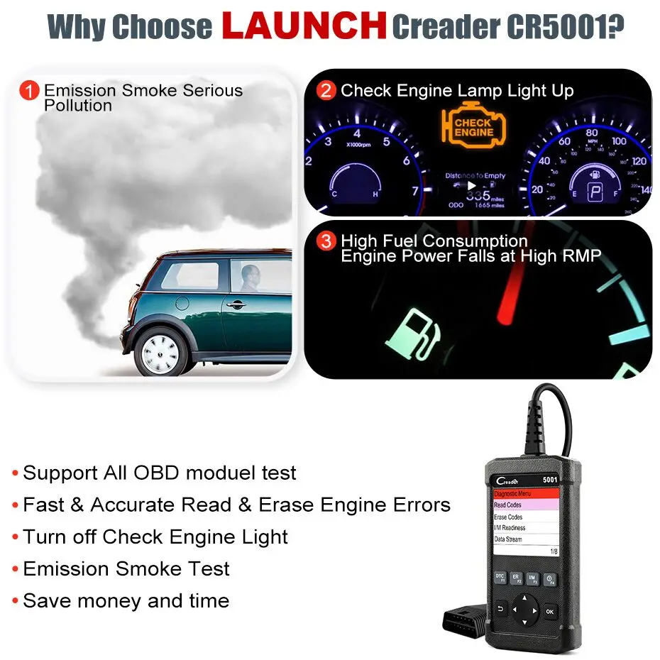 Полностью совместим-- Launch CReader 5001 предоставляет полные диагностические функции OBDII/EOBD и выполняет протоколы, такие как ISO9141-2, ISO14230-4, SAEJ1850 и ISO15765-4.Its, основная функция включаетПросмотр потоков данных,Состояние готовности,Данные о раме замораживания, DTCs, между тем testEvap, излучение двигателя, датчик O2, система воспламенения, Misfire; Выключите MIL и так далее.
