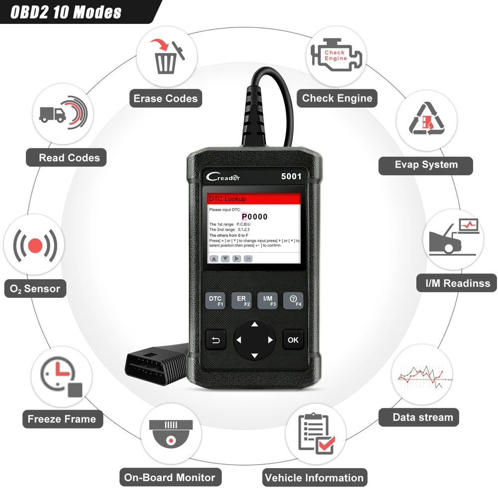 Знайте свой автомобиль --- с 10 режимами obd2, этот CR5001 имеет общий вид на систему EVAP, бортовой монитор, датчик O2 и текущие данные, дайте вам знать, какие части и системы не работают, что дает вам полный контроль над вашим автомобилем.