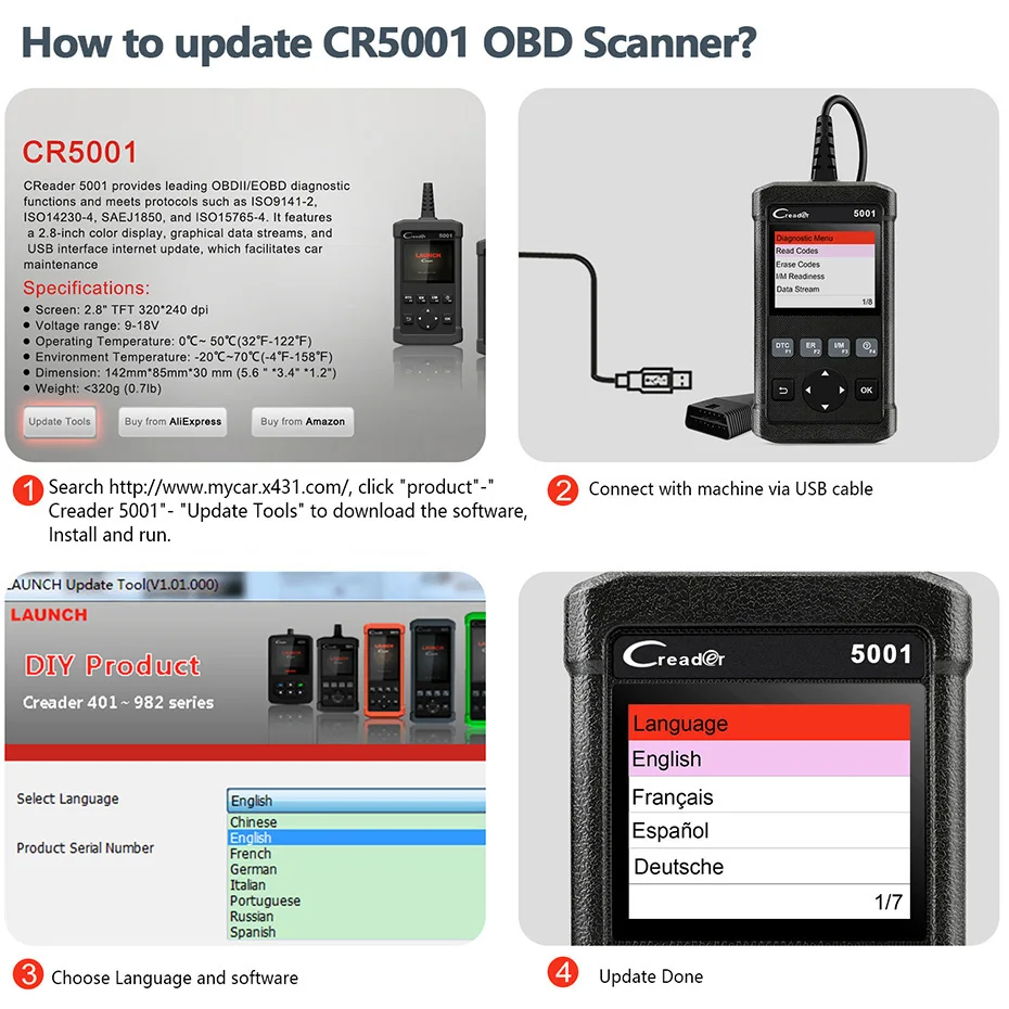 Сильная поддержка базы данных --- встроенный DTC CR5001, позволит вам узнать код ошибки Без поиска в Интернете. С бесплатным онлайн обновлением от запуск веб-сайта, вы можете обратиться к новейшей версии программного обеспечения.