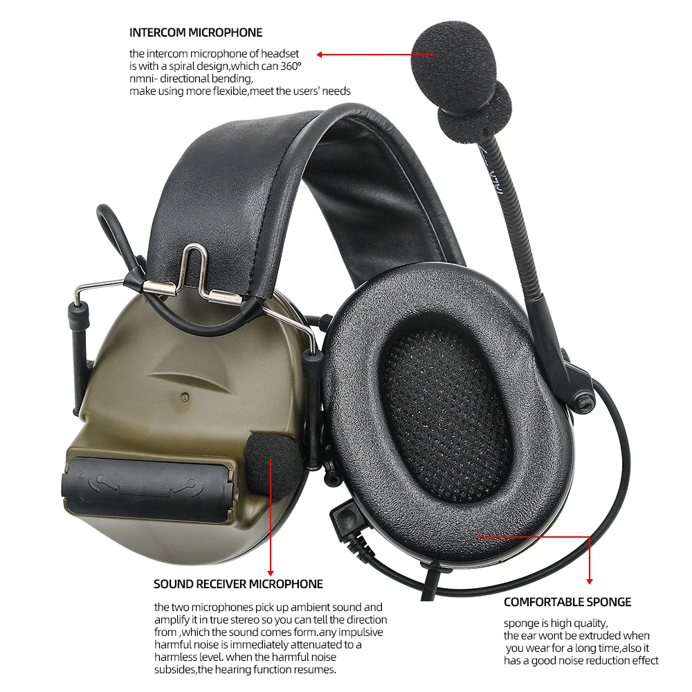 Тактические наушники Comtac II сочетают в себе самые современные наушники с объемным звуком, электроника для прослушивания звука и новый тонкий дизайн чашки профиля. Гарнитуры Comtac II имеют двойные микрофоны с наушниками, которые позволяют номерам слышать звуки окружающей среды на 360 градусов, а также возможность подавления выстрелов и других ударных шумов. Микрофоны с чашками обеспечивают возможность прослушивания звука через плечо. Электроника моментально подавит вредные ударные шумы до 82 дБА внутри ушных чашек, усиляя при этом до 18 дБ внешние шумы/голоса. U94 Кен штекер оборудованная-данную гарнитуру прекрасно работает с помощью прилагаемого u94 K-штепсельная вилка с помощью 7,0 мм военный штепсельную вилку и клавишей PTT во время. Высокопрочные материалы-кабель штепсельной вилки сделан из кевла-провода и TPE-покрытия, который растягивается, прочный и антифриз, не легко стареть и жестко. Повязка на голову изготовлена из первого слоя воловьей кожи, которая не легко деформируется и слаба. Наушники из губки-Удобная губка, губка высокого качества, ухо не выдавливается, когда вы носите в течение длительного времени, а также имеет хороший эффект шумоподавления. Защита микросхем-чип этой гарнитуры хорошо защищен пленочным слоем, что обеспечивает повышенную защиту и является защитой от плесени, пыли и влаги. Электронное шумоподавление-благодаря технологии активного шумоподавления и захвата, эти наушники обеспечивают более четкий, естественный звук и защиту для ваших ушей.