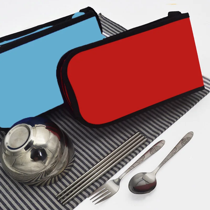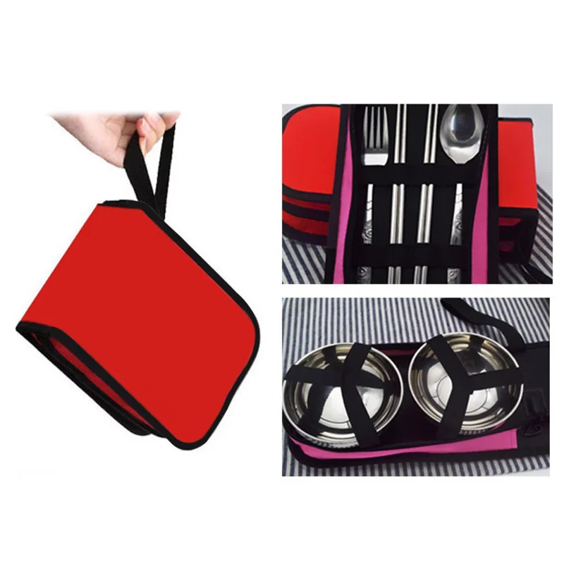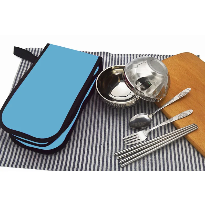 Материал: нержавеющая сталь; Размер: 11,2x6 см (чаша), 17x3,8 см (вилка, ложка), 18,3 см (палочки для еды)Цвет: красный, синий, розовый