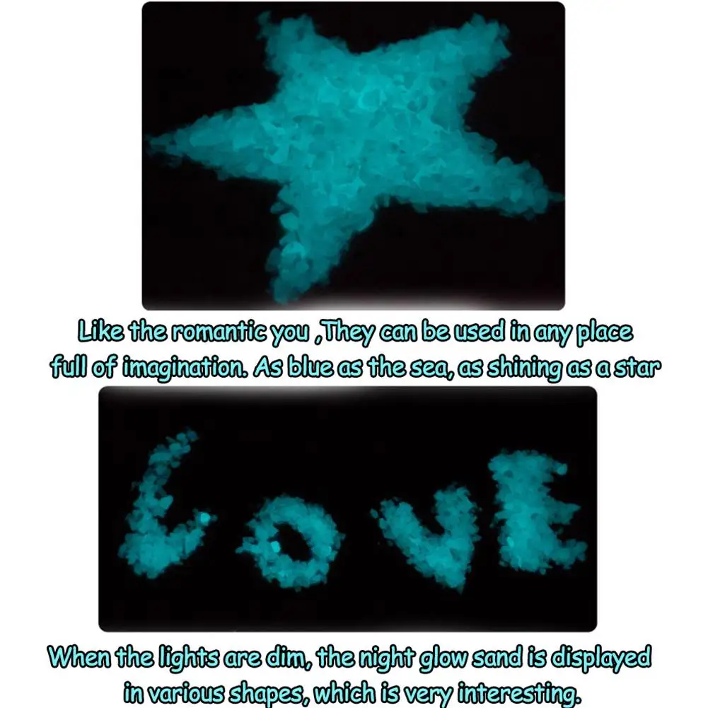 Использование: светящийся песок может быть самосветящимся после того, как он освещается солнцезащитный светильник, естественный светильник или светильник, и повторяет цикл бесконечно