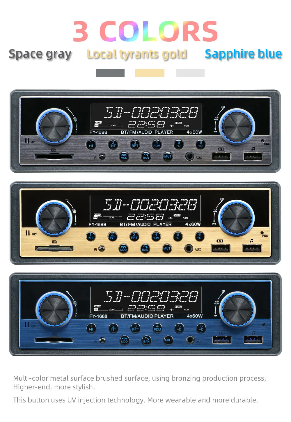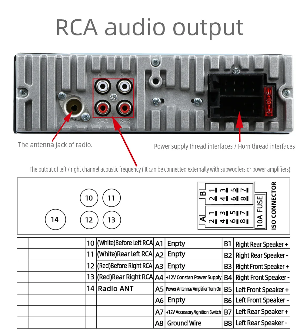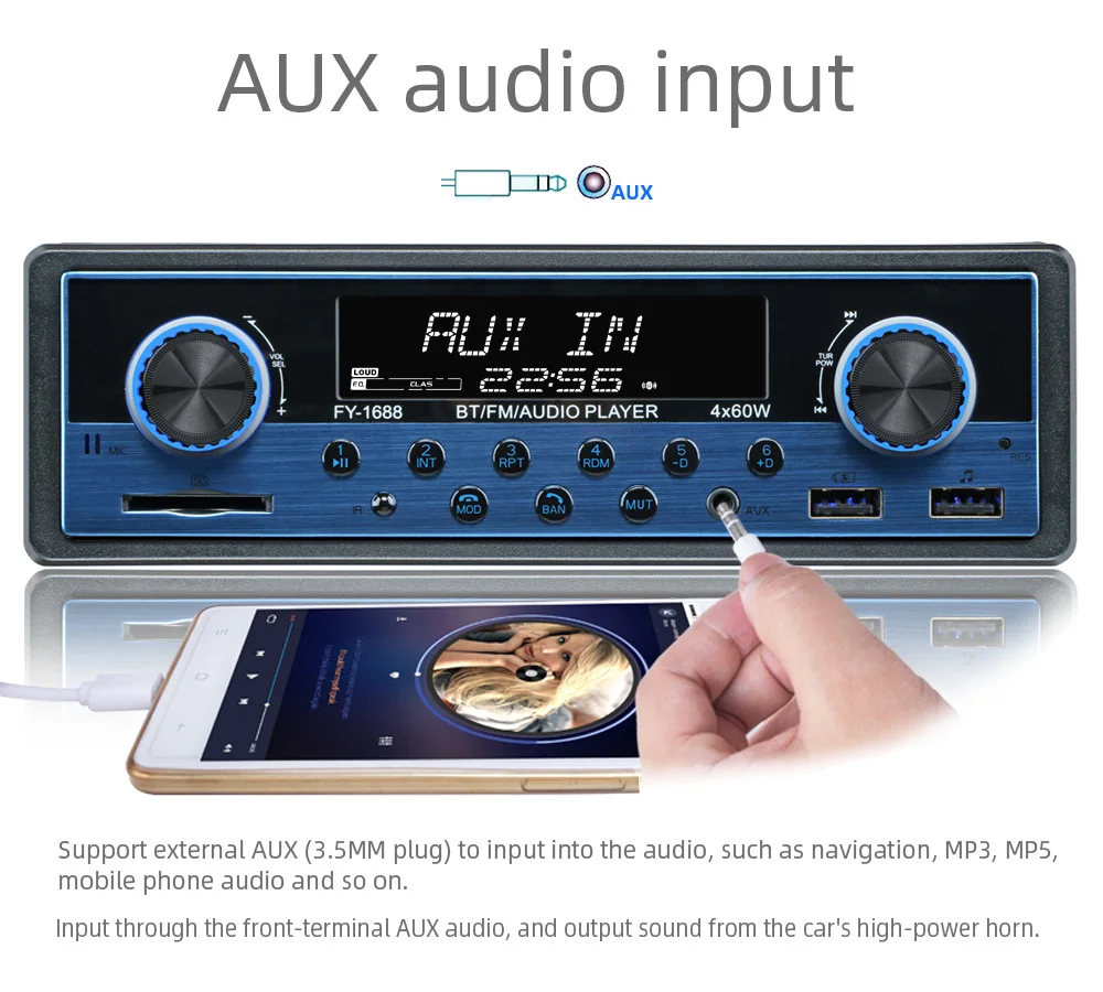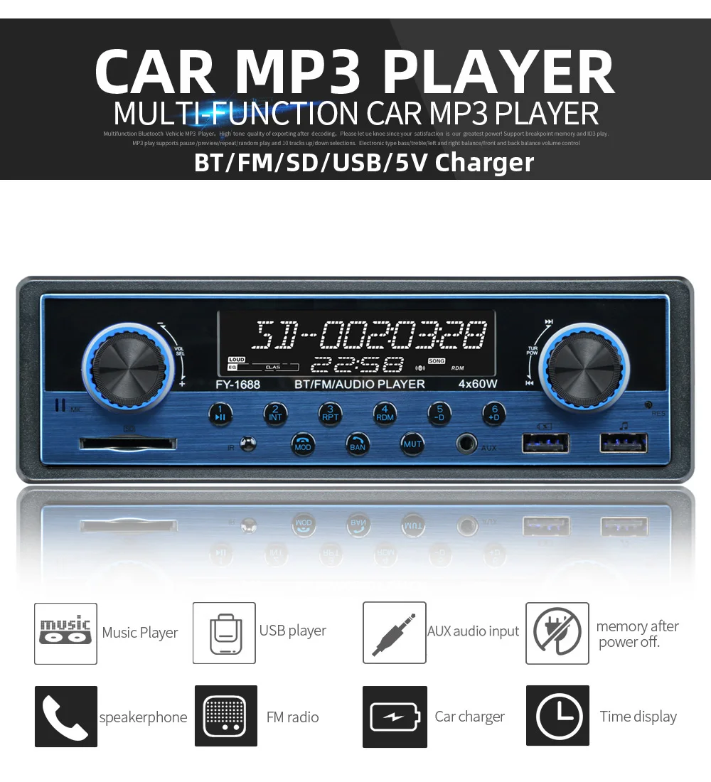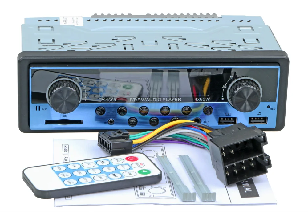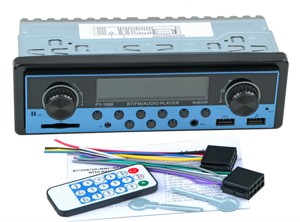 Матовые металлические панели, два usb-порта, доступны несколько цветов. Встроенный Bluetooth + микрофон (версия Bluetooth 4,2) Встроенный протокол зарядки IOS IC, Поддержка IOS/Android phone 5 V зарядка, зарядный ток до 2,1 А. Поддержка громкой связи. Поддержка расширенного режима передачи звука. Поддержка индикации часов во время выключения питания. Высококачественное цифровое стерео радио Функция FM/AM/RDS является необязательной. 18FM/12 AM Предустановленная радиостанция FM с функциями RDS, AF (альтернативный список частот), TA (сообщение о дорожном движении, программа дорожного движения), PTY (тип программы) Радиочастотный шаг регулируется для Европы/США. Поддержка USB/SD кард-ридер. Поддержка аудио: FLAC/MP3/WMA/WAV форматы и так далее. Поддержка функции воспроизведения папок Поддержка памяти точки останова и ID3 play. Поддержка дистанционного управления. Вращающийся электронный регулятор громкости MP3 play поддерживает пауза/предварительный просмотр/повтор/случайное воспроизведение и 10 треков вверх/вниз. Электронный Тип Басов/ВЧ/левый и правый баланс/передний и задний баланс регулятор громкости Выбор различных режимов эквалайзера: плоский, поп, классический, рок и т. Д. Поддерживает бесшумное и равное управление громкостью (LUOD). Переднее входное отверстие AUX аудио и задний Терминал L/R аудио RCA выходное отверстие. 4 трека высокой мощности (4 громкоговорителя высокой мощности) Рабочее напряжение: DC12V-14.4V Размер установки металлических рам (мм): 182 (ширина) * 52 (высота) Длинный размер корпуса: 178 мм (ширина) * 50 мм (В) * 100 мм (D) Короткий размер корпуса: 178 мм (ширина) * 50 мм (В) * 68 мм (D) Размер формы: 188 мм * 58 мм (В)