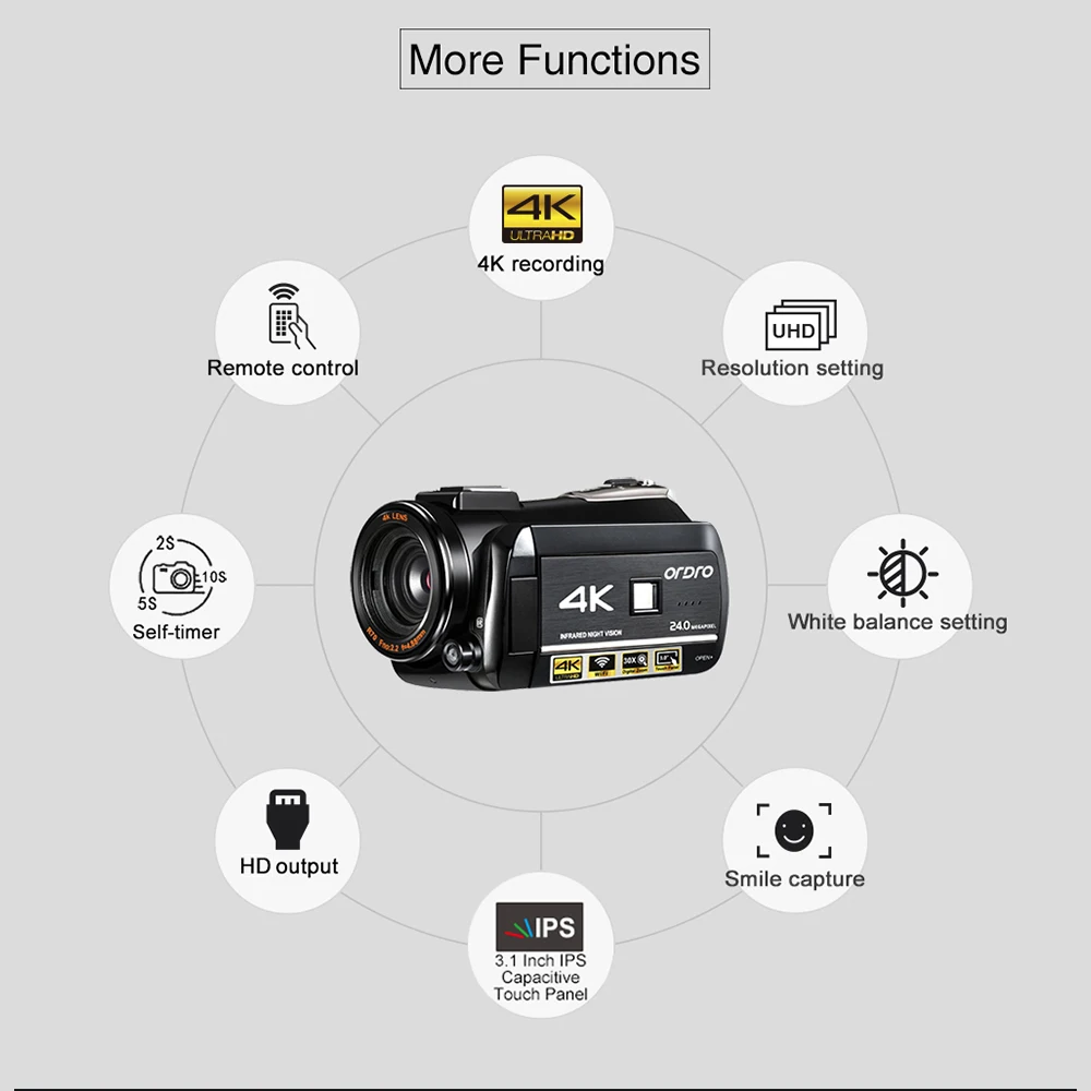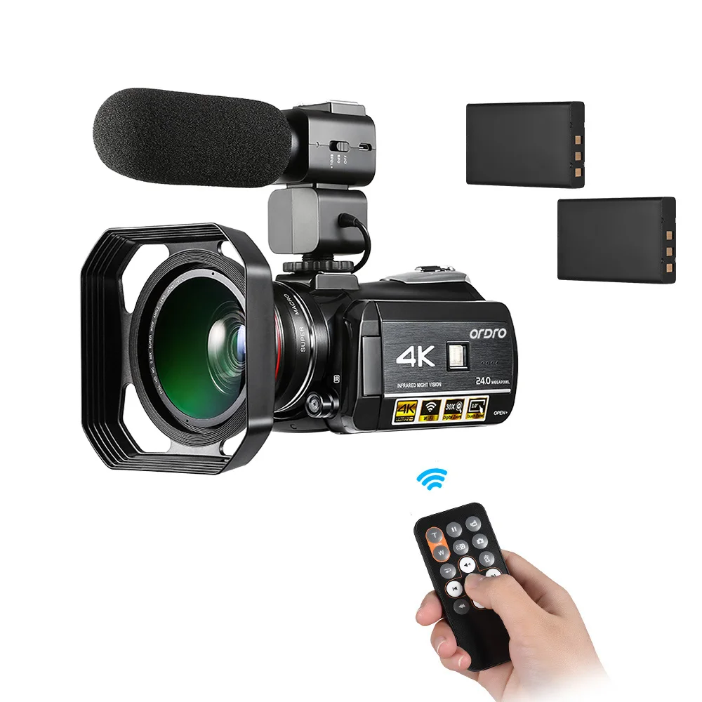 ORDRO AC3 4K 24MP WiFi Digital Video Camera Camcorder DV 3.1 Inch IPS LCD Touchscreen with 2*Batteries+Lens+Microphone+Lens Hood