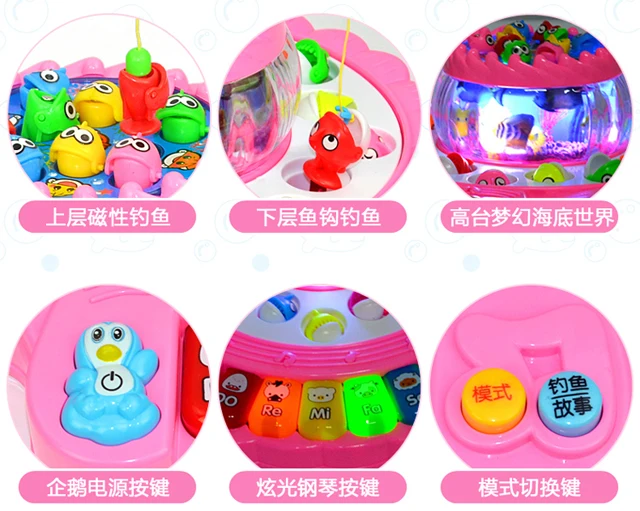 Запчасти Рыбная тарелка * 2, магнитная Удочка * 2, Удочка * 2, маленькие рыбки * 10, большие рыбки * 16 Особенности: 1. Красивый цвет 2. Игровой режим 3. Режим воспроизведения музыки 4. Китайский режим истории 5. Режим фортепиано