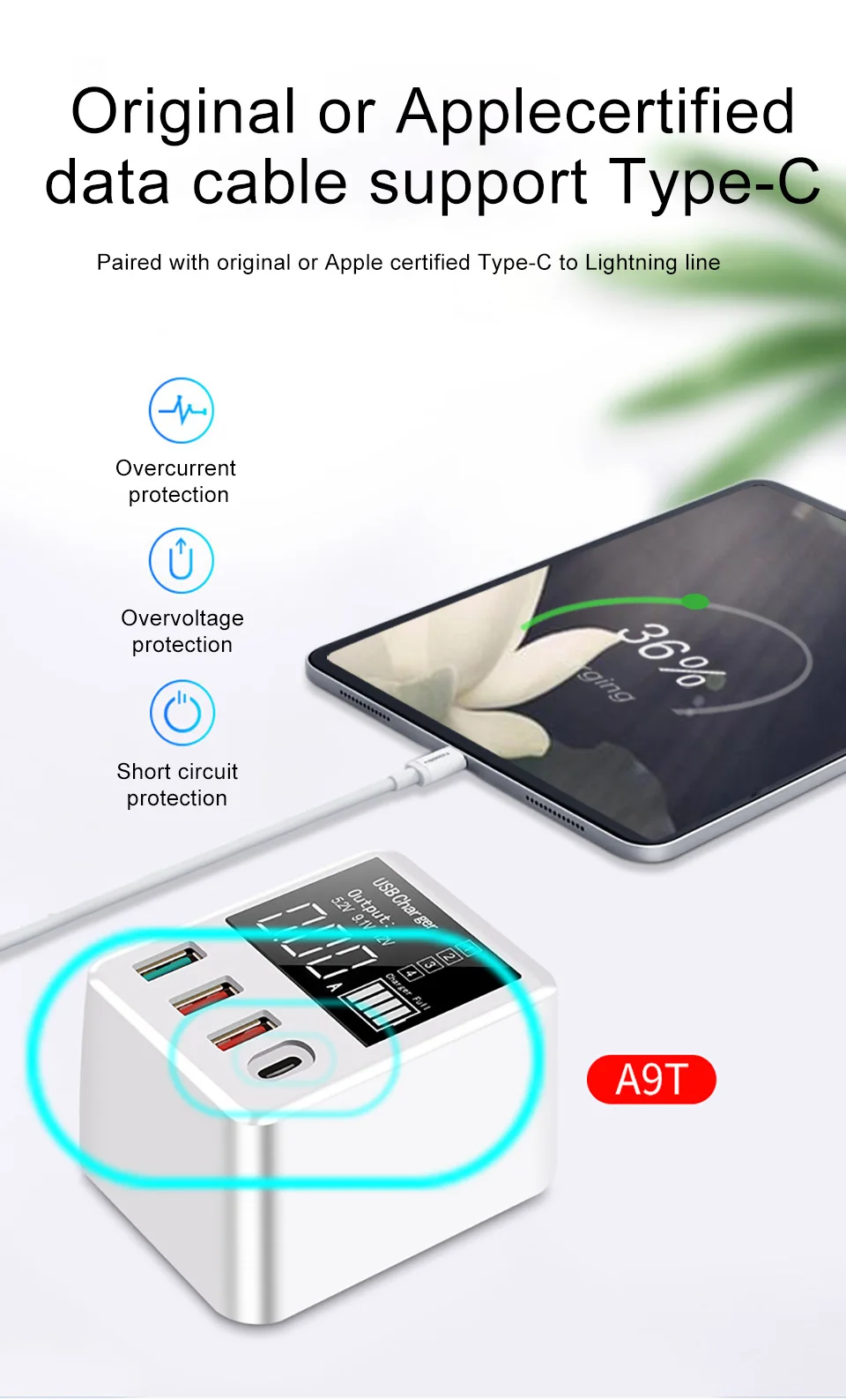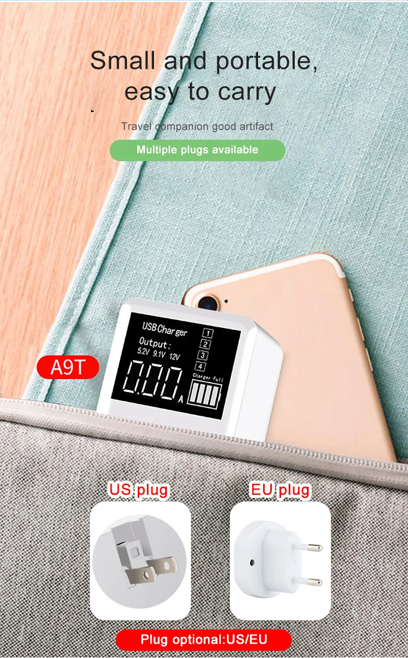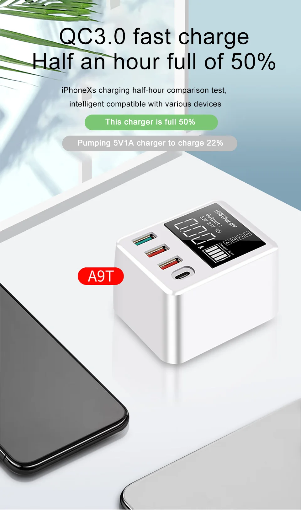 Как быть быстрой зарядкой: 1. Мобильный телефон должен поддерживать технологию быстрой зарядки QC 3,0 2. Зарядный кабель также должен поддерживать быструю зарядку 3.0 функция: зарядное устройство USB + быстрое зарядное устройство Type-C + умный цифровой дисплей + универсальное + настенное зарядное устройство дорожный адаптер входное напряжение: 100-250 В переменного тока/а 50-60 Гц Общая мощность: 30 Вт Выход типа c: 5 В/3 А (макс.) Общий Выход: DC 5V/6A QC 3.0 Выход: 5 В/3,4 А: 9 В/2 А: 12 В/1,5 А (макс.) Обычный Выход: 5 В/2,4 А стандарт вилки: вилка США, вилка ЕС, вилка UK (опционально)