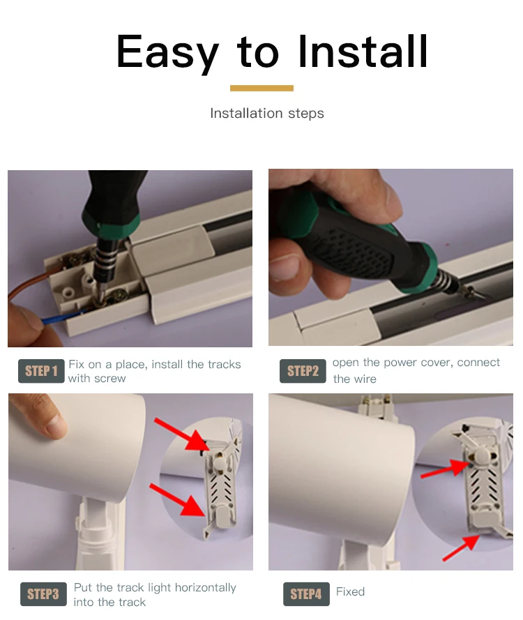 Шаг 1: Закрепите место, установите треки с помощью винта Шаг 2: Откройте крышку питания, подключите провод Шаг 3: Поместите Трековый светильник горизонтально в трек Шаг 4: фиксированный