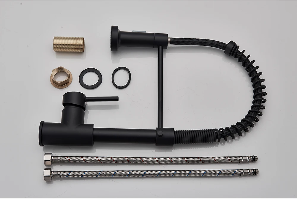 Материал корпуса смесителя: латунь Материал ручки крана: латунь Материал головки распылителя: АБС-пластик С 2 трубами для холодной и горячей воды Матовый черный кухонный кран смесителя 360 градусов вращения струйный распылитель сопла горячий холодный кран