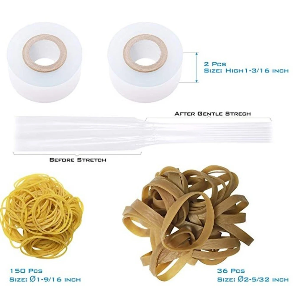 В комплект входят ножницы для прививки, 3 лезвия для прививки, 2 ленты для прививки, 30 шт широкие резиновые ленты, 150 резинок, упакованные в черный пакет, чтобы удовлетворить все ваши потребности.