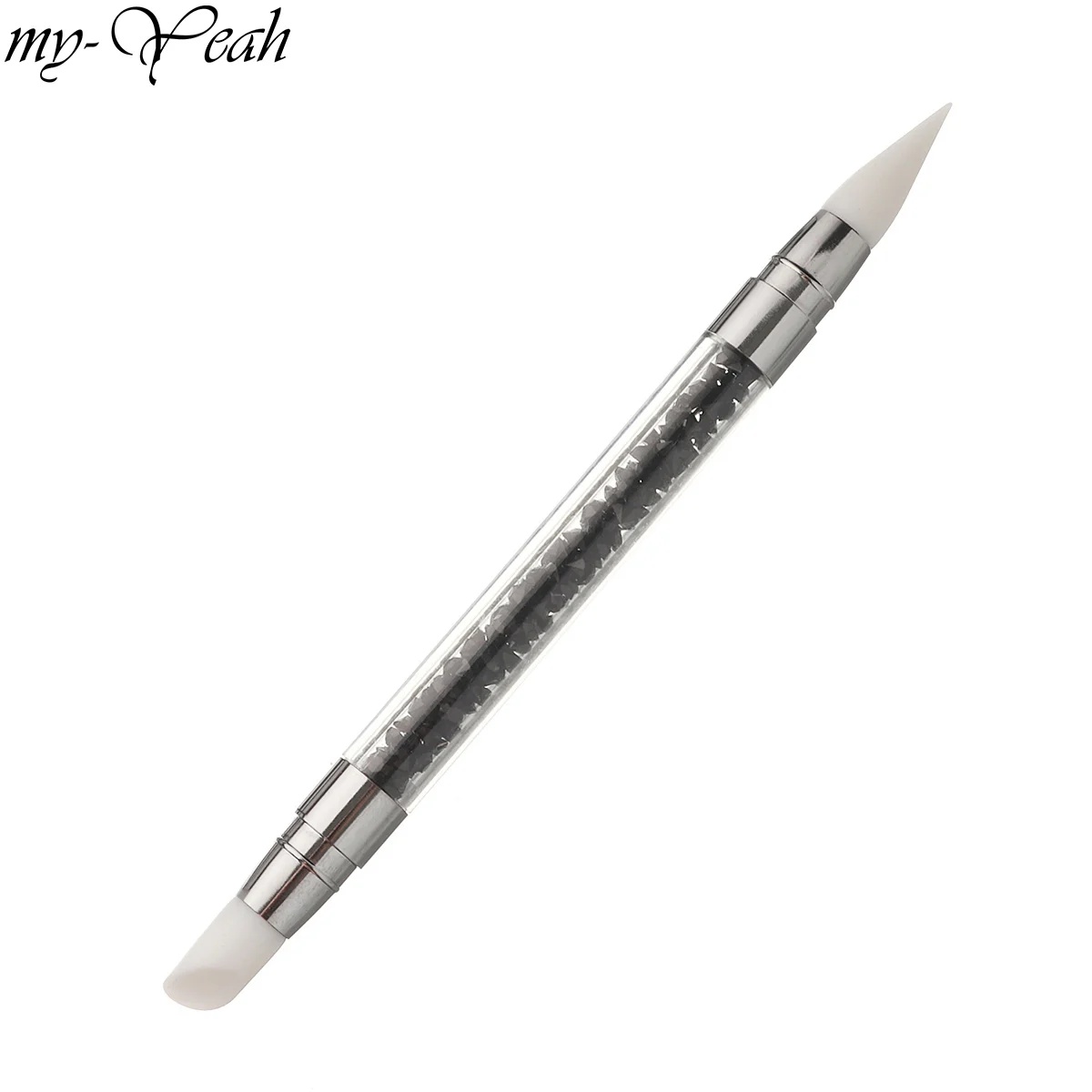 Акриловая ручка со стразами внутри и металлический наконечник с силиконовой головкой.