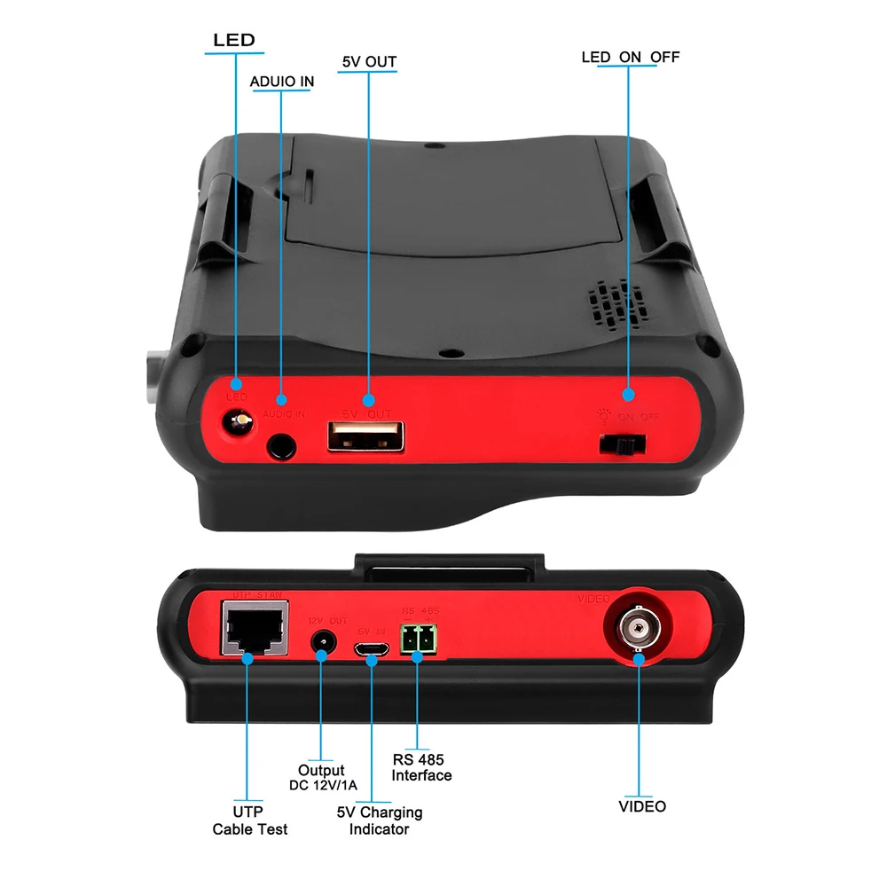 5 дюймов b,HD разрешение экрана 800*480 c, поддержка 8MP AHD + TVI + CVI/CVBS видео тестер d,UTC (HD коаксиальный контроль, BNC коаксиальный Контроль PTZ, но не могу позвонить в меню камеры) и RS485 и UTP функции