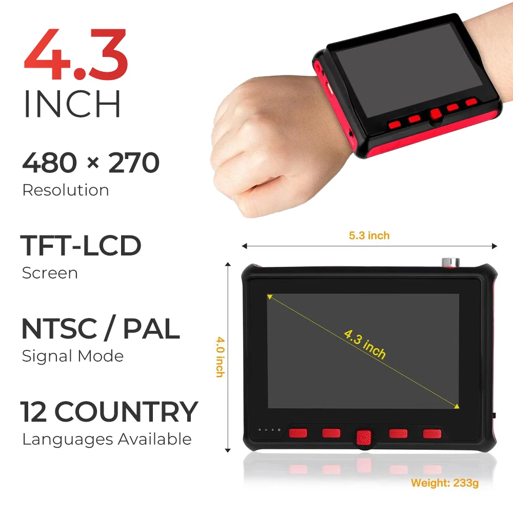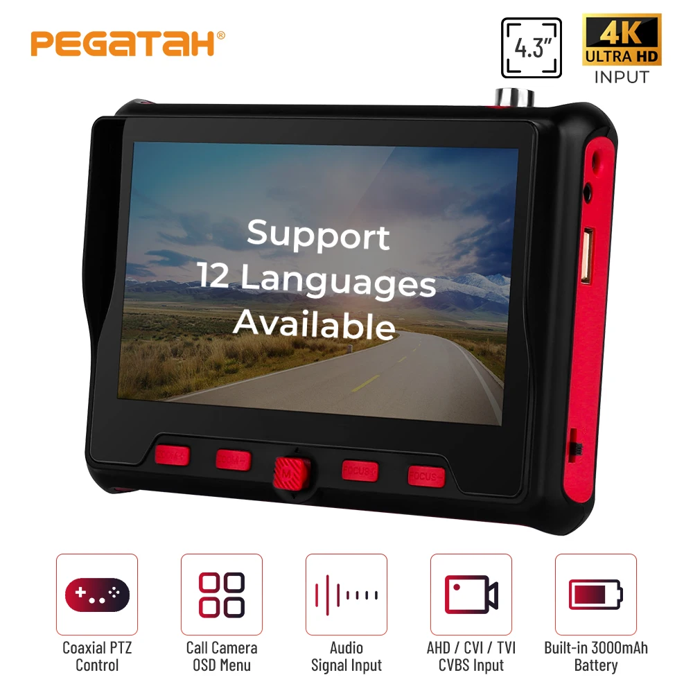 Экран 4,3 дюйма, Разрешение экрана: 480x272 Емкость батареи: 3,7 в 3000 мАч 4 в 1 видеосигнал AHD/TVI/CVI/CVBS Разрешение видео: 2MP-8MP AHD TVI CVI 720P @ 25/30/, 1080P25/30F(3MP/ 4MP/5MP/8MP) поддержка управления RS485 PTZ, тест сетевого кабеля UTP может достигать 100-150 метров, 12V1A выходная мощность, USB5V1A выходная мощность 12 языков