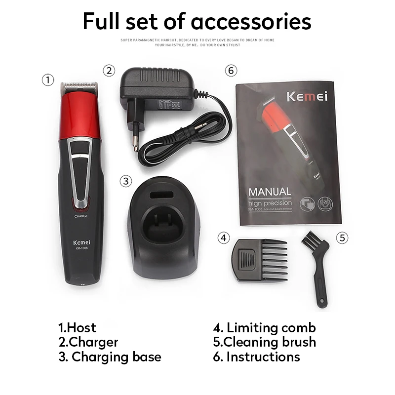 1 x машинка для стрижки волос, 1 x направляющая расческа, 1 x зарядный адаптер, 1 x чистящая щетка, Руководство по эксплуатации на английском языке-1 шт.