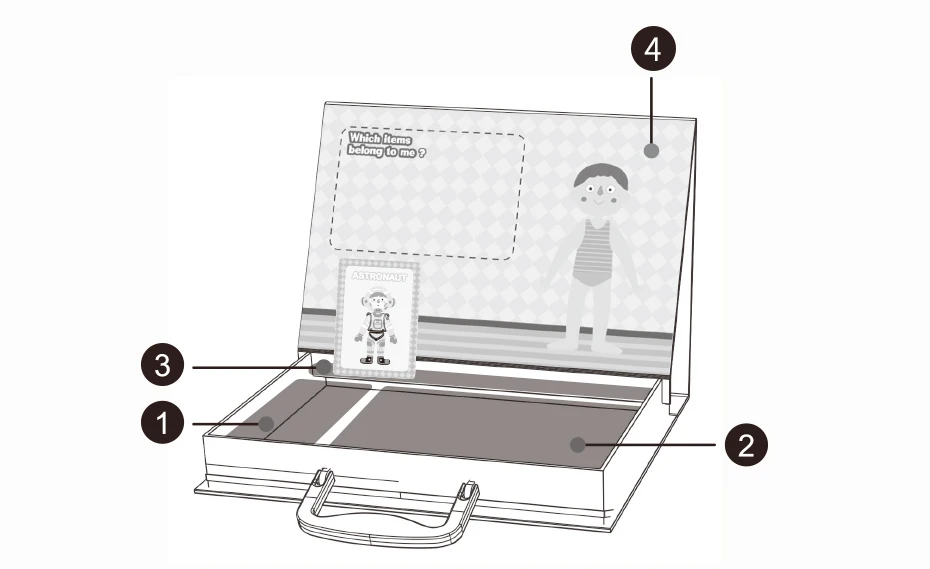 1. Площадь размещения карт Q & A 2.все области размещения магнитов 3. Зона размещения держателя ручки 4. Рабочая панель