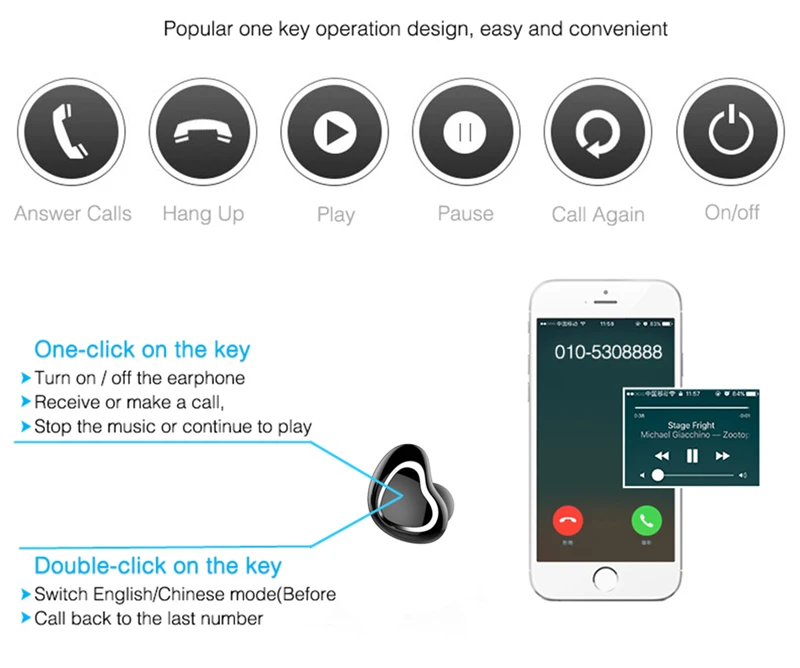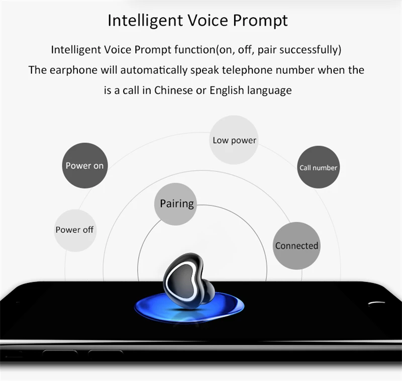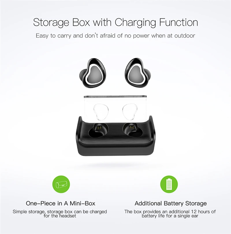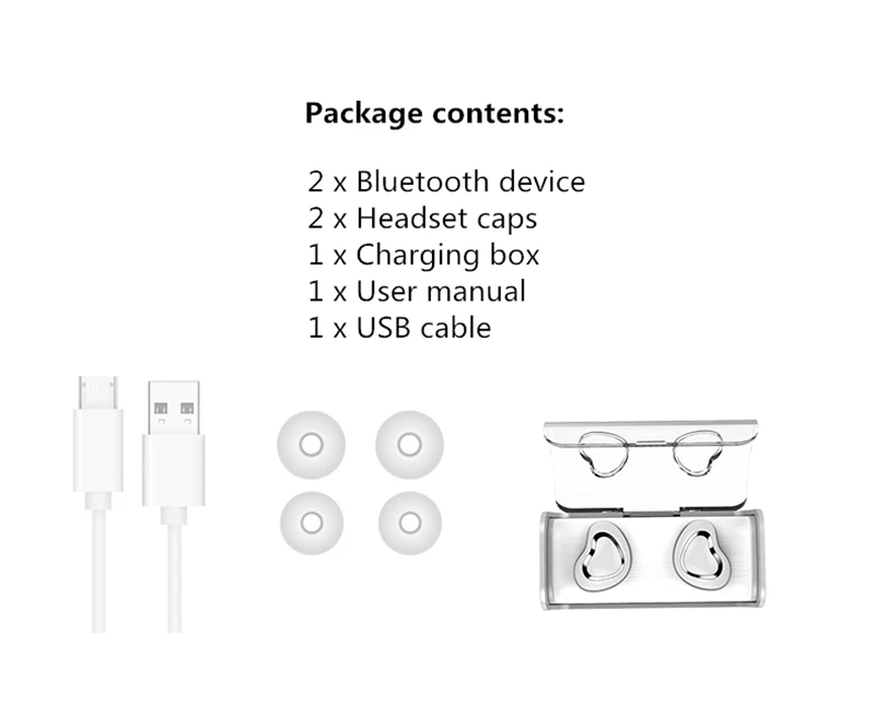 Упаковочный лист 2 * Беспроводной наушники 1 * кабель для зарядки 1 * зарядный чехол 2 * ушной Шапки 1 * Руководство по эксплуатации на английском языке