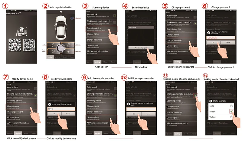 Автоматически Управляйте автомобилем по телефону. (Используйте приложение) разблокировка при приближении автомобиля 2 м, Блокировка при выходе автомобиля 3 м. Встряхивание мобильного телефона 2 раза для блокировки/разблокировки. Дистанционное открытие багажника